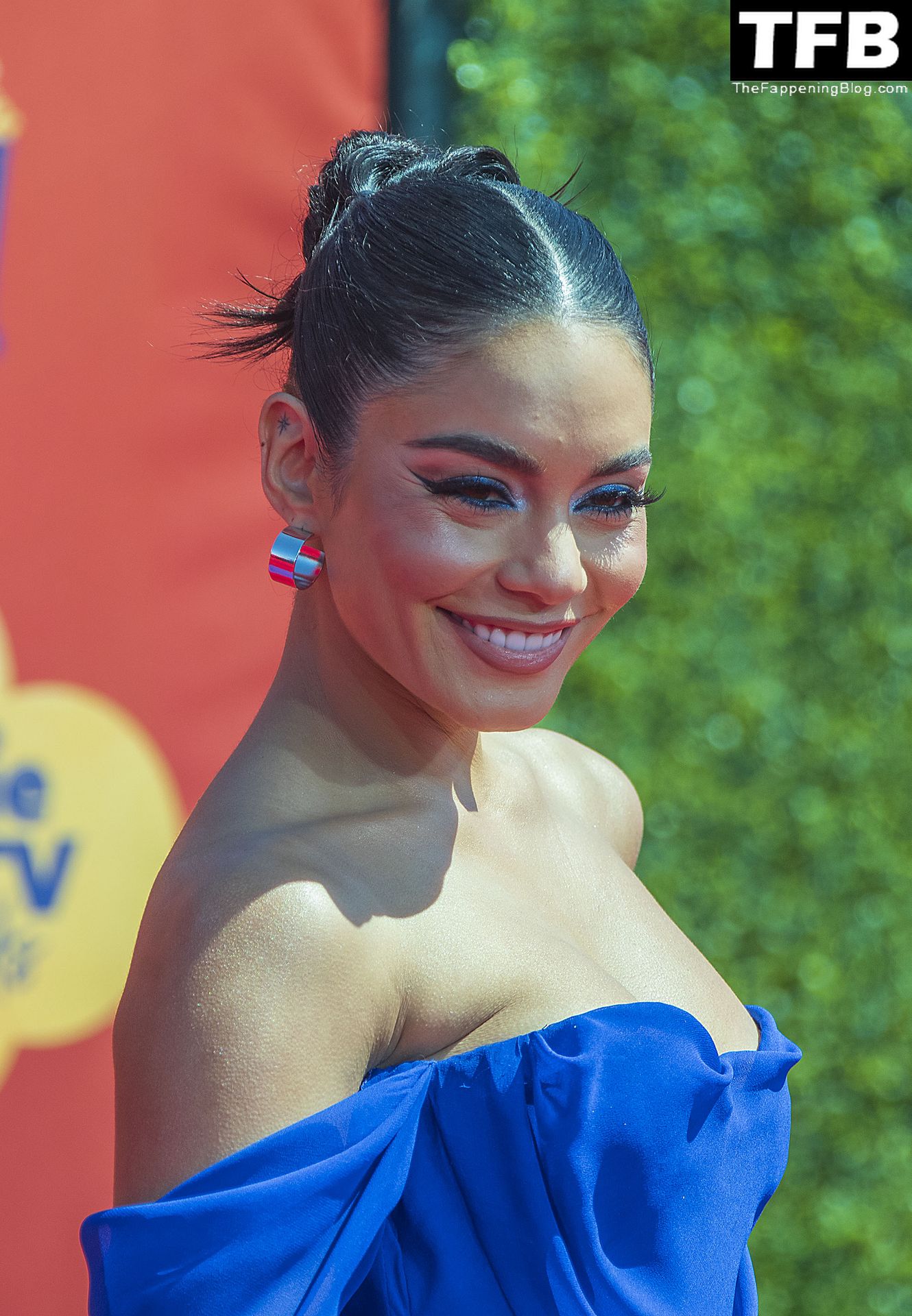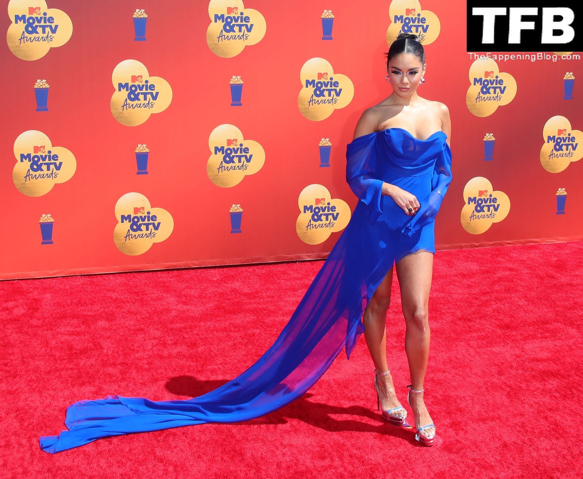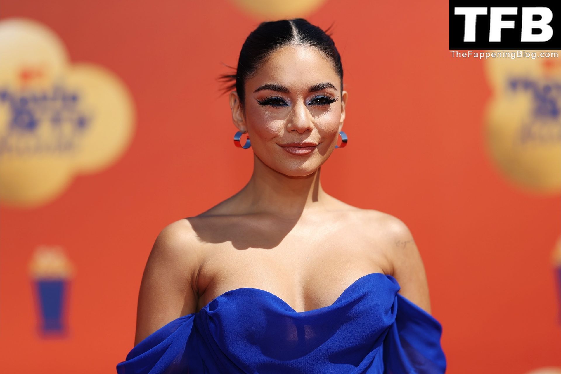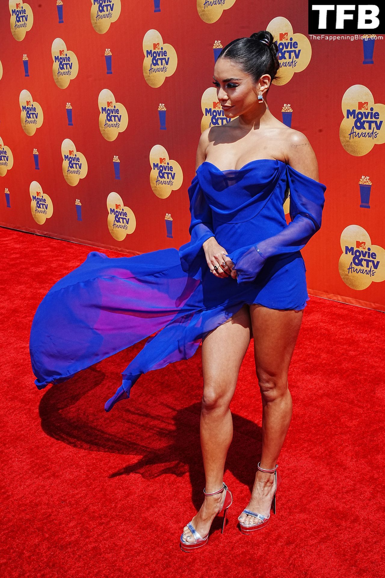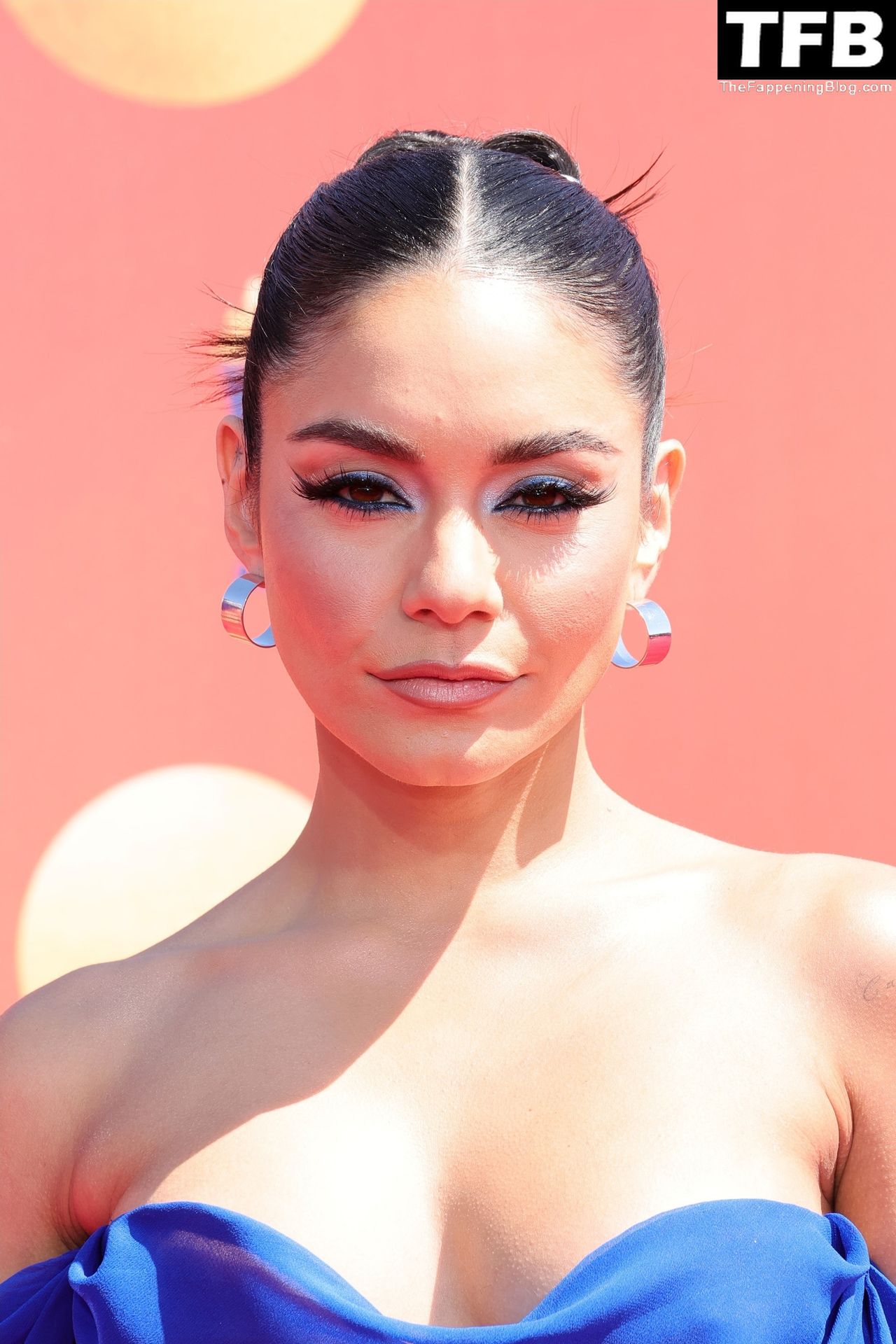 La star du Fappening Vanessa Hudgens pose en robe bleue sur le tapis rouge des MTV Movie & TV Awards au Barker Hangar à Santa Monica, le 05/06/2022.