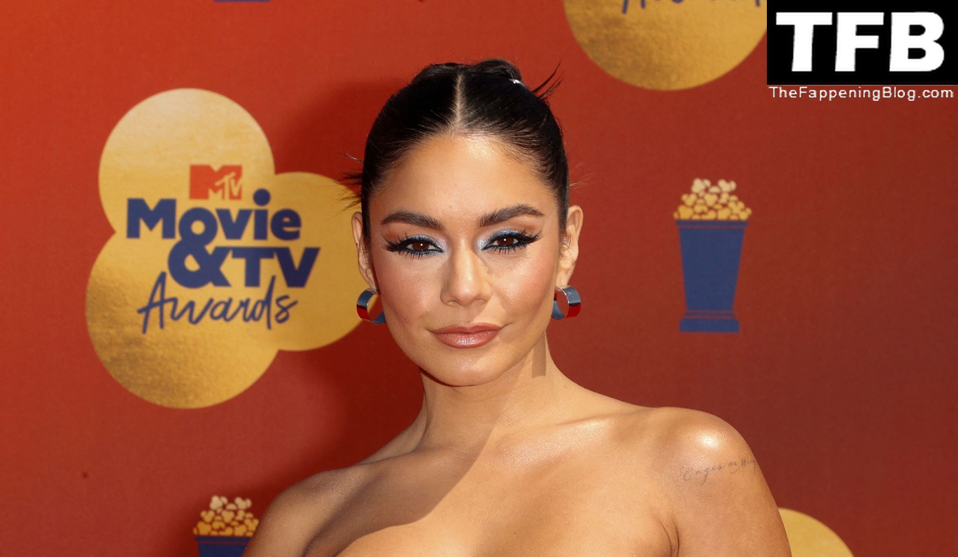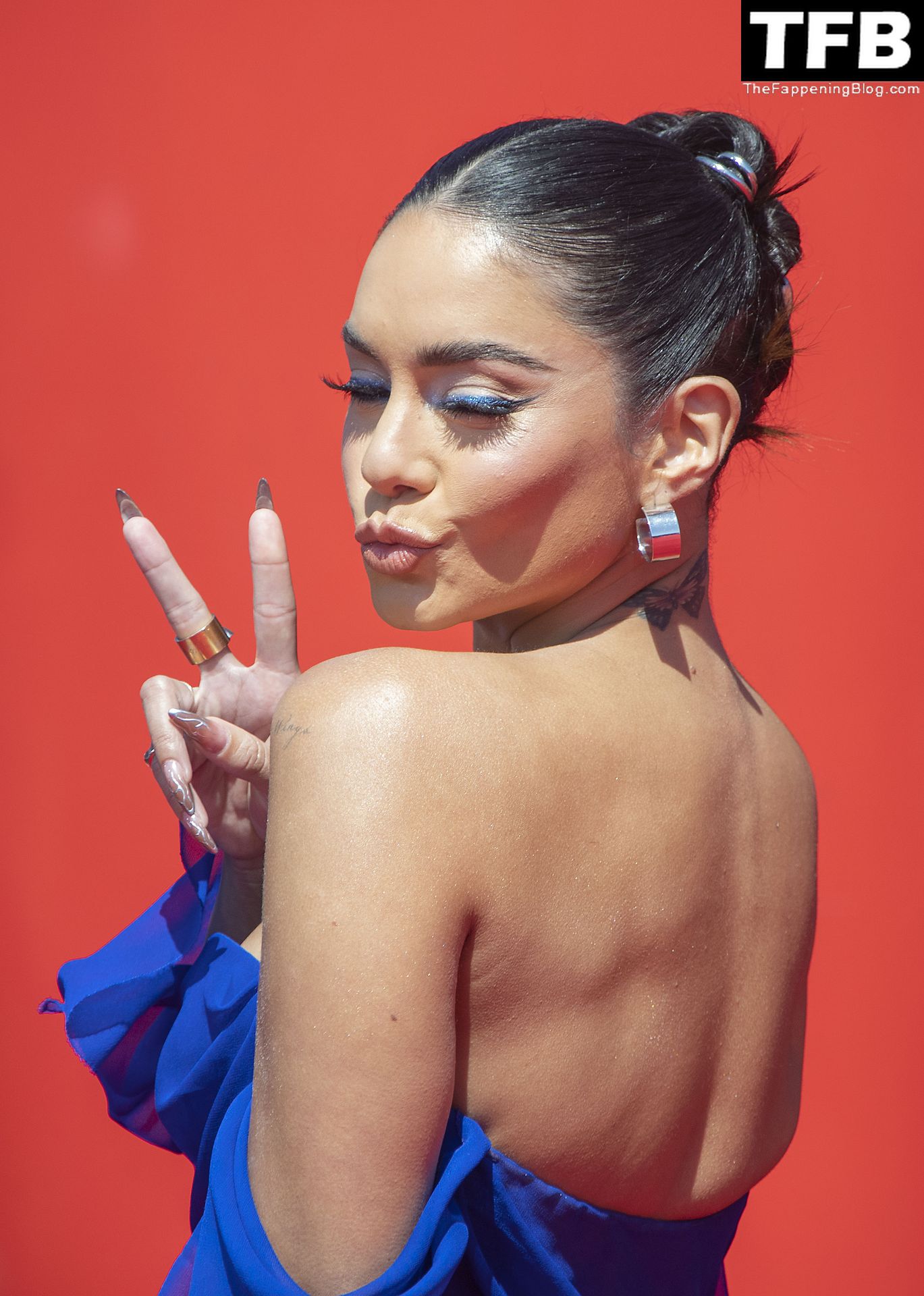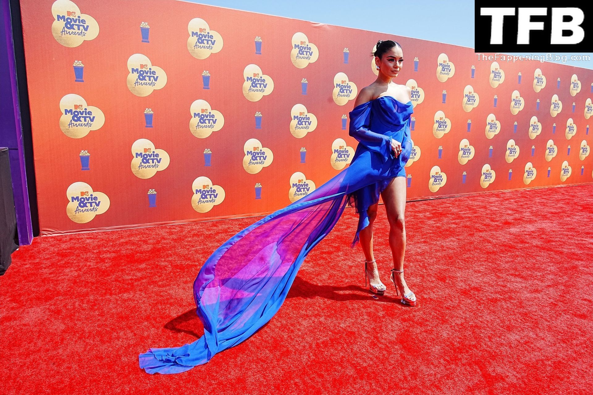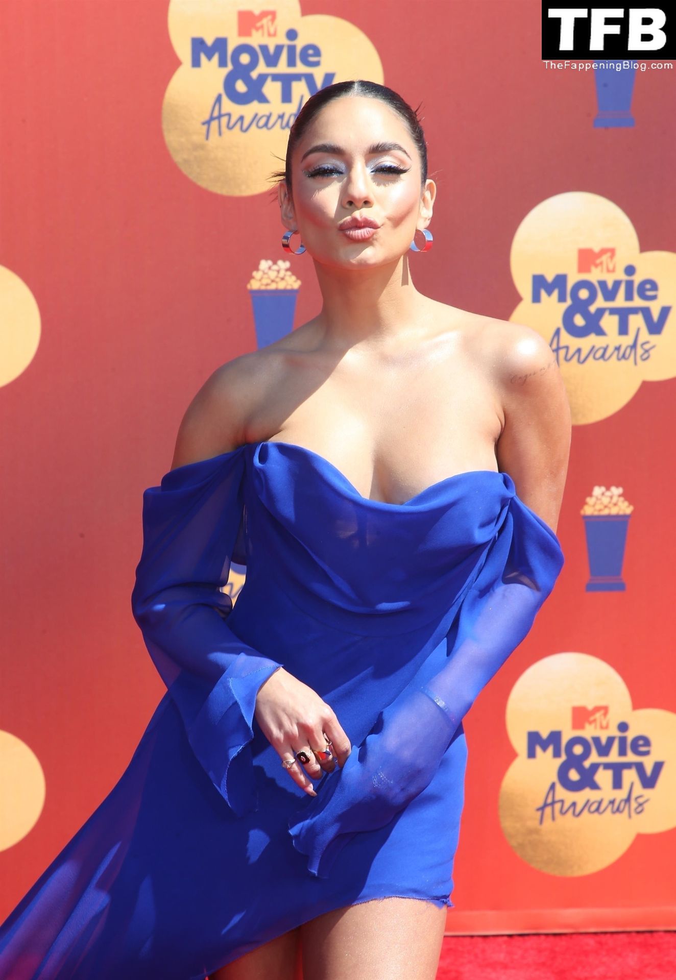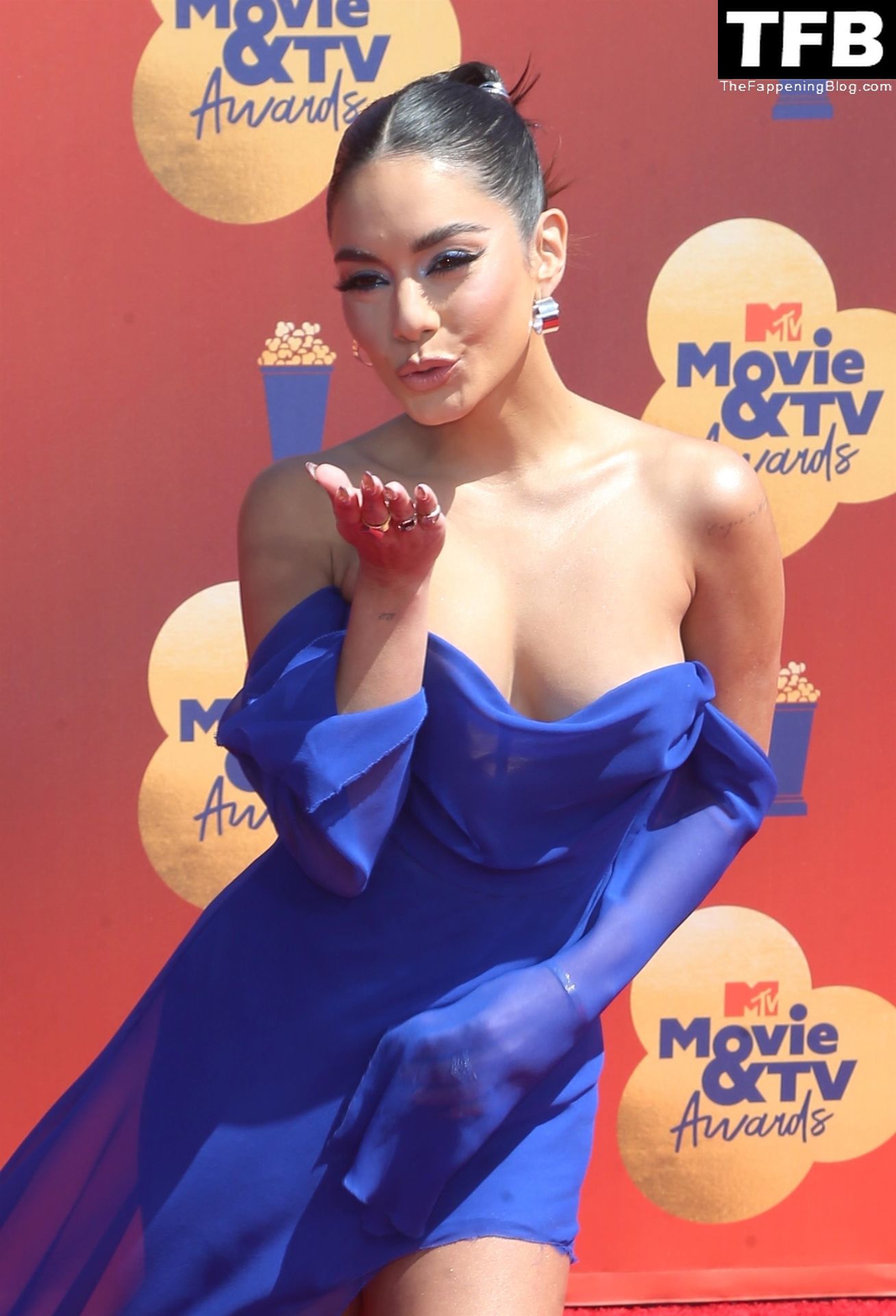 La star du Fappening Vanessa Hudgens pose en robe bleue sur le tapis rouge des MTV Movie & TV Awards au Barker Hangar à Santa Monica, le 05/06/2022.