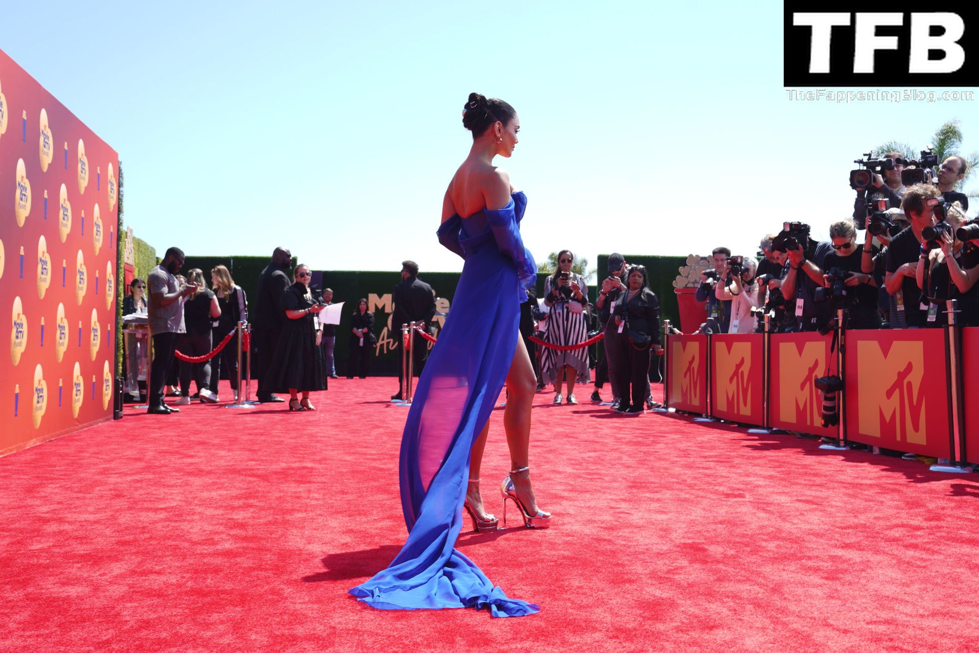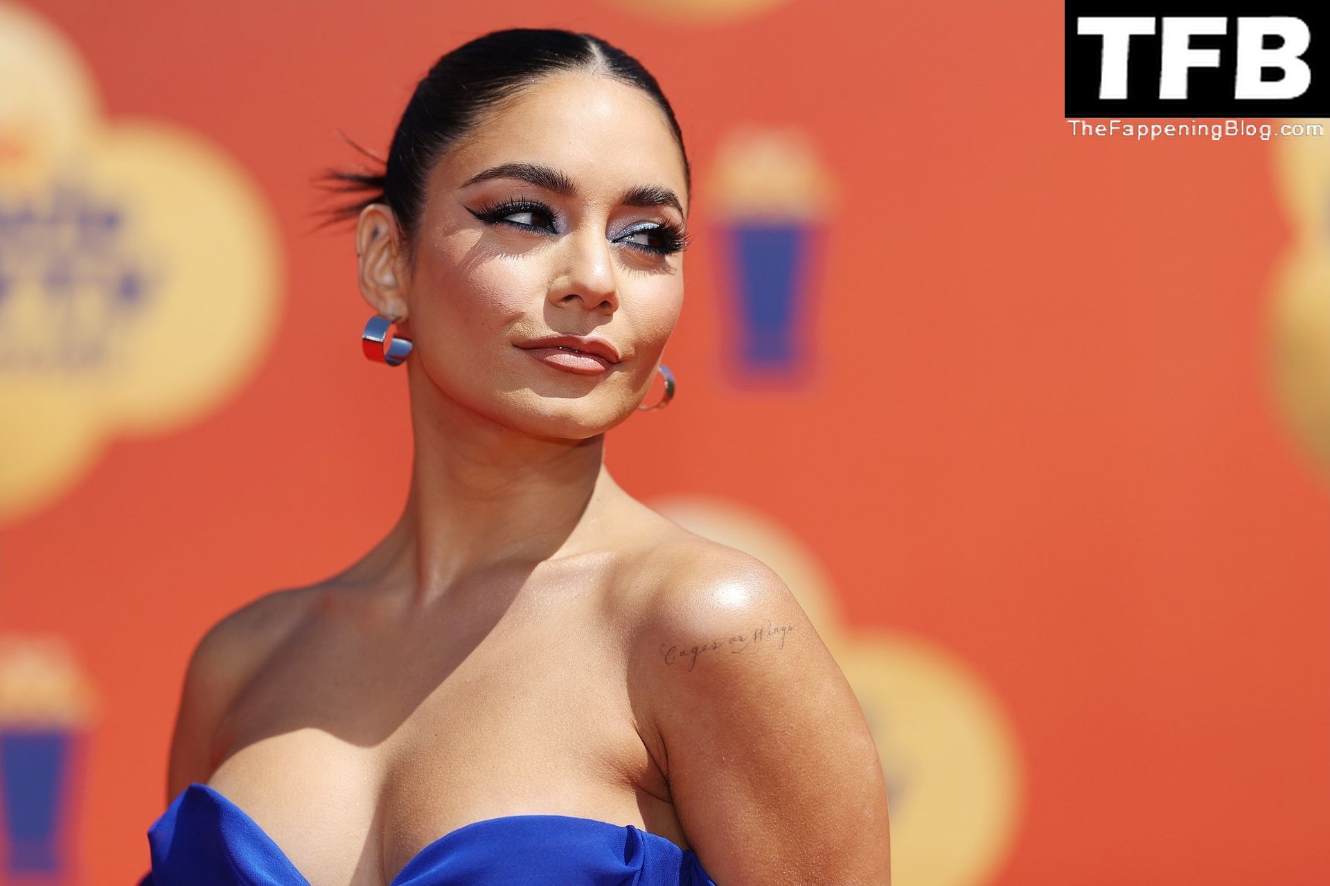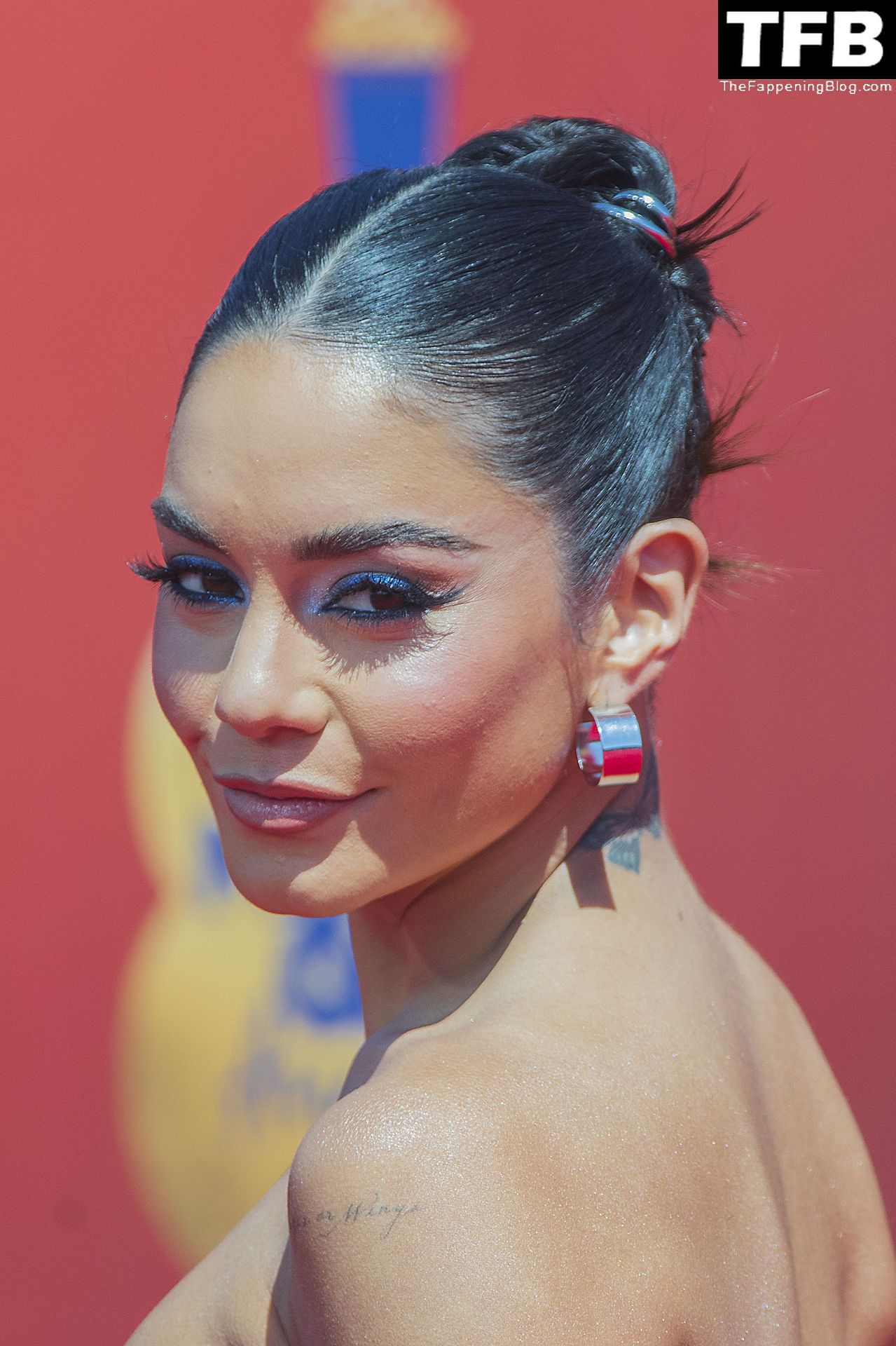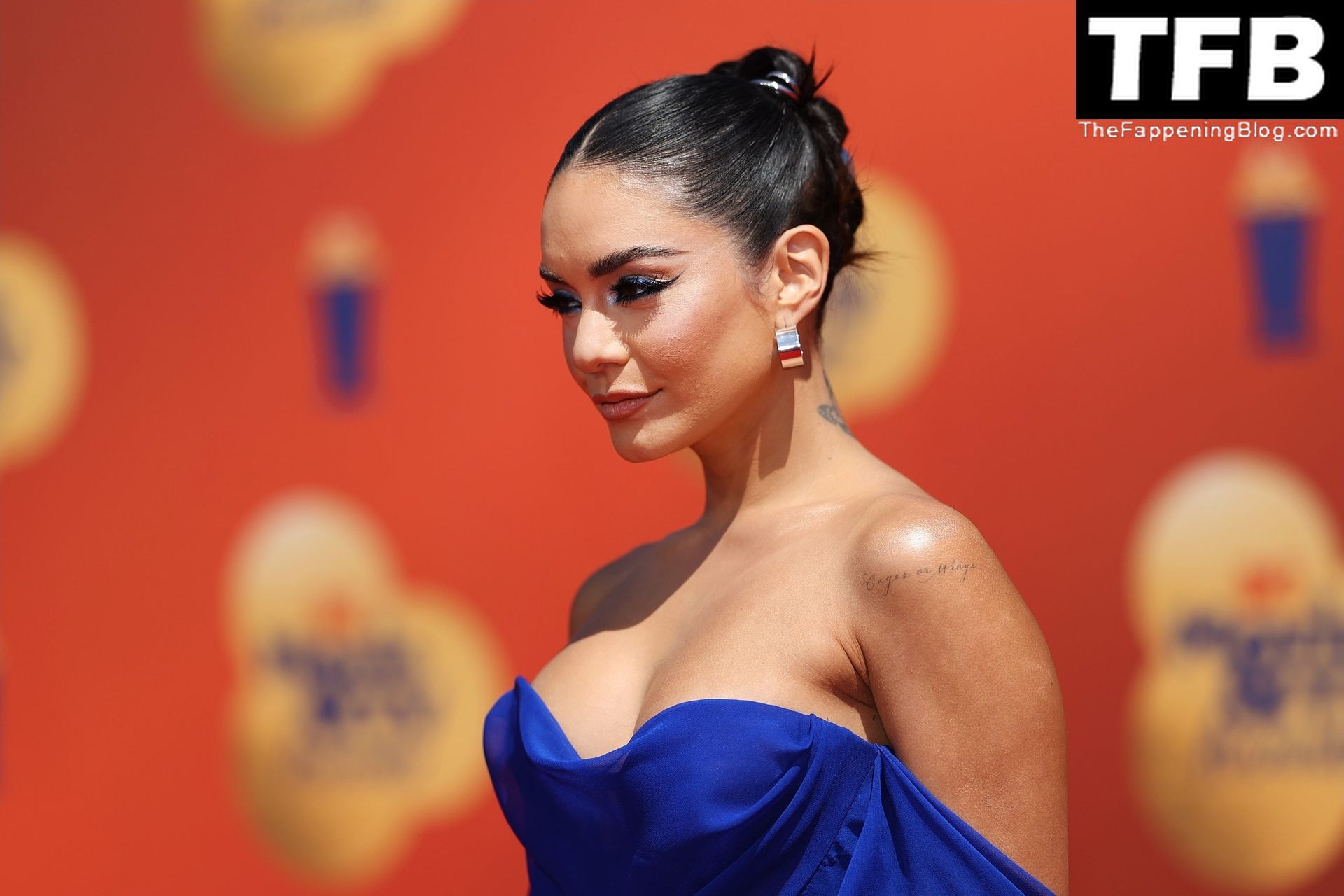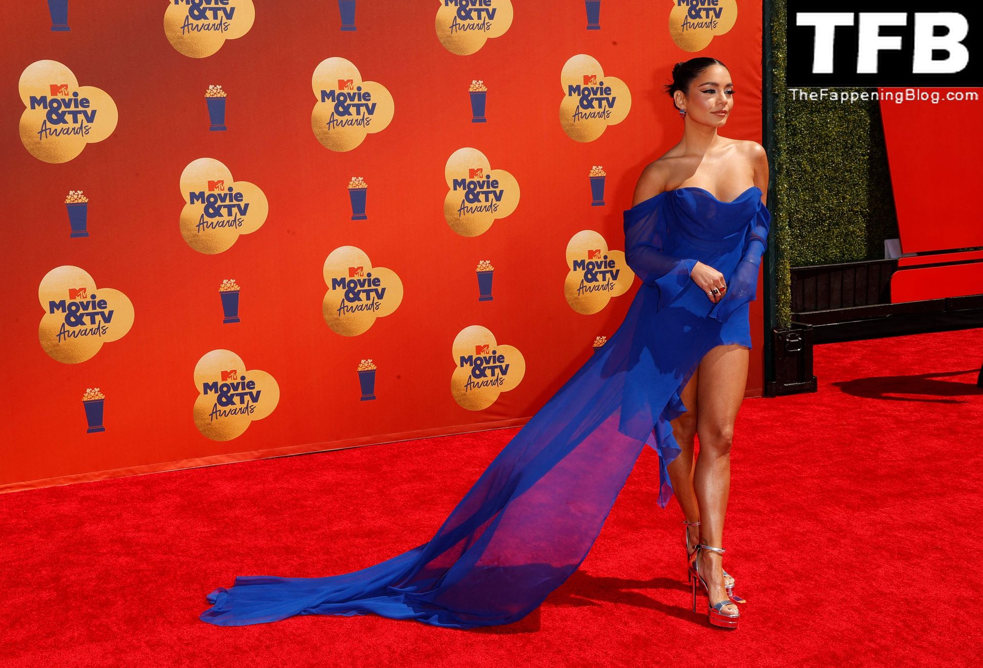 La star du Fappening Vanessa Hudgens pose en robe bleue sur le tapis rouge des MTV Movie & TV Awards au Barker Hangar à Santa Monica, le 05/06/2022.