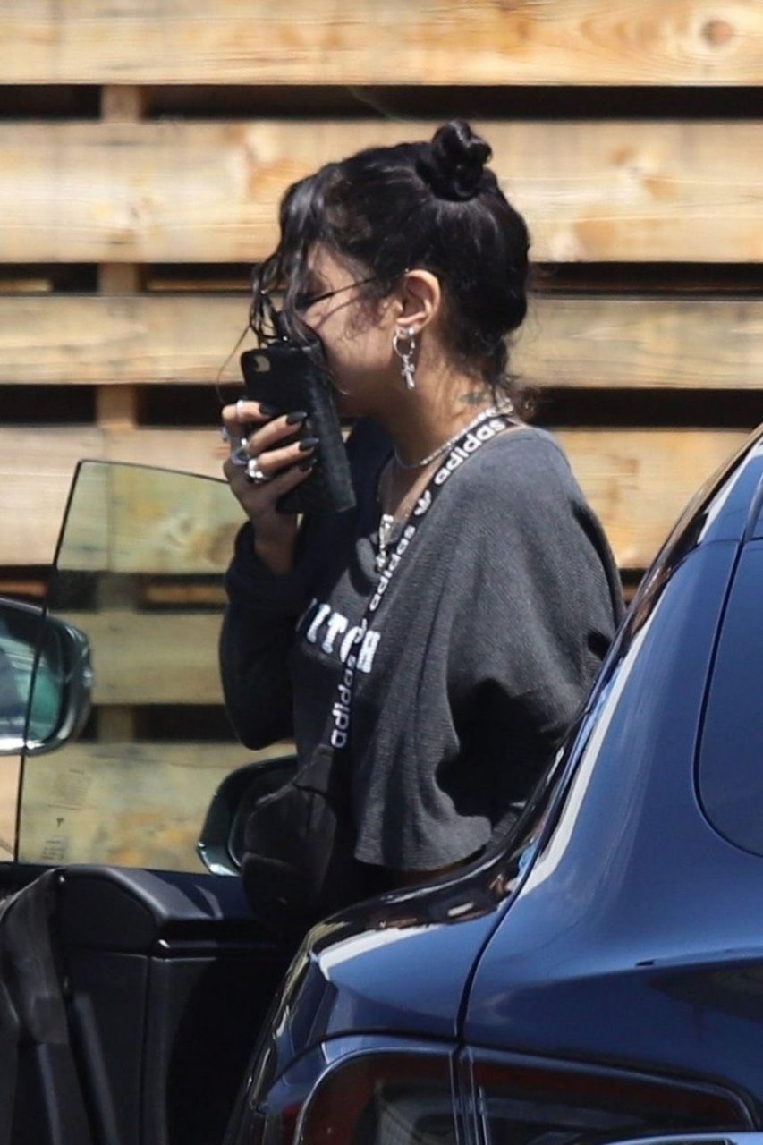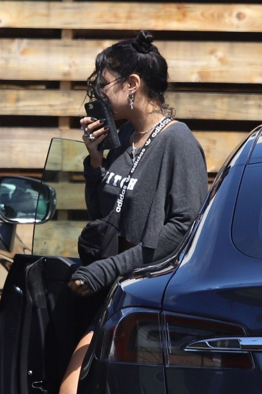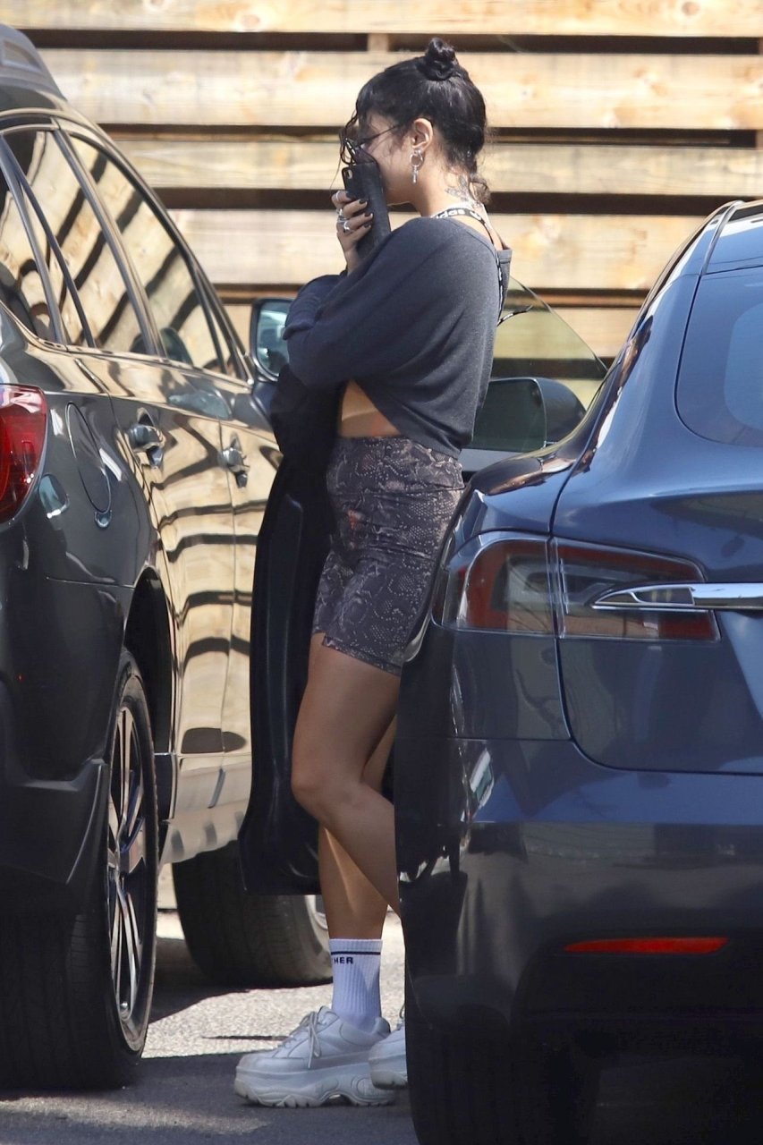 Vanessa Hudgens a un look décontracté alors qu’elle fait des courses à Los Feliz, 14/09/2019. Vanessa est superbe avec des lunettes de soleil, un pull ample court, un short de cycliste imprimé peau de serpent, et des chaussures blanches à plateforme.