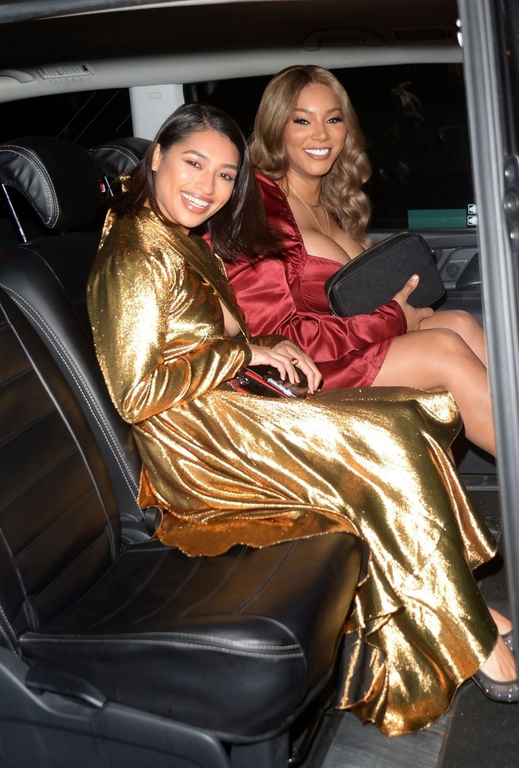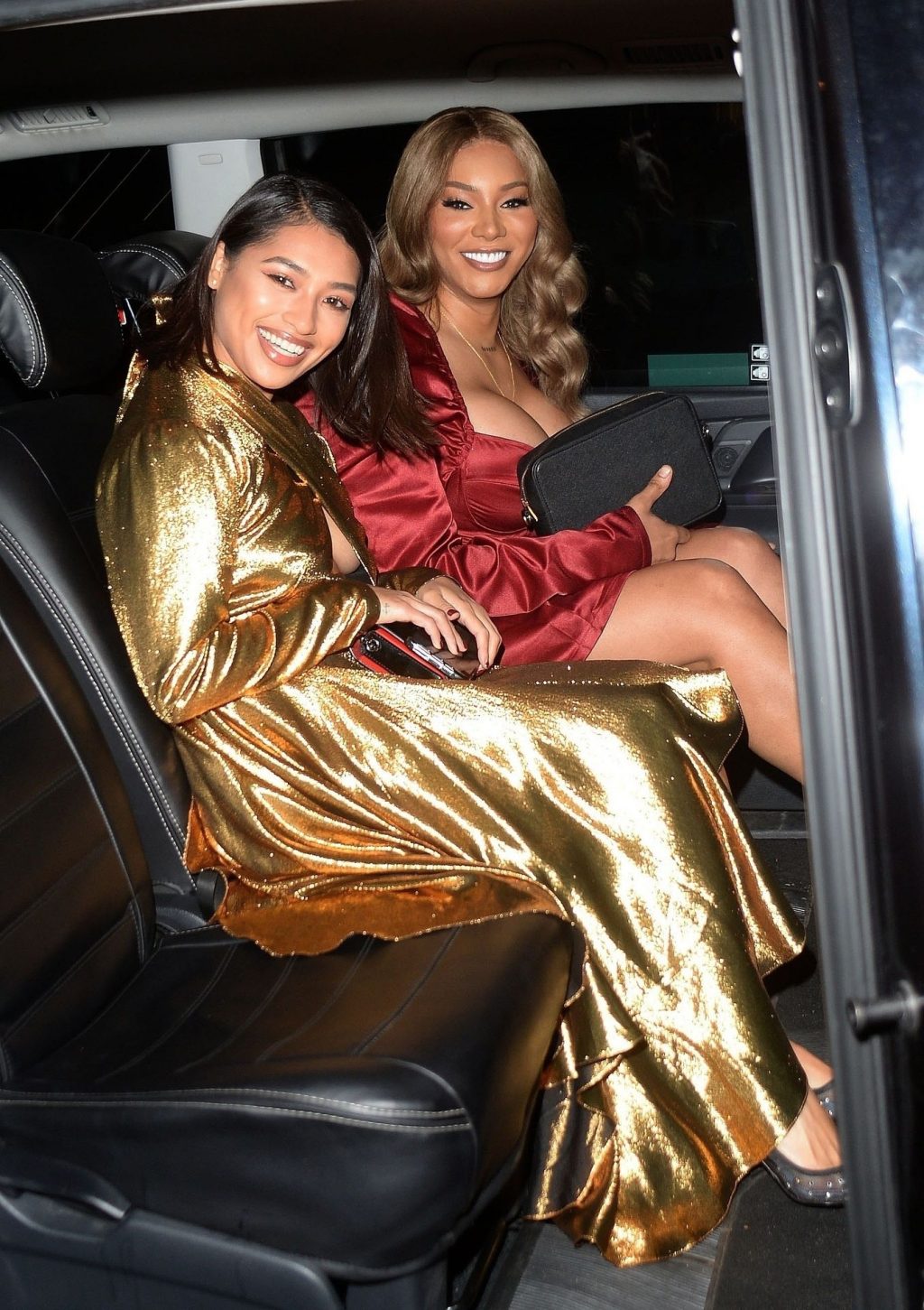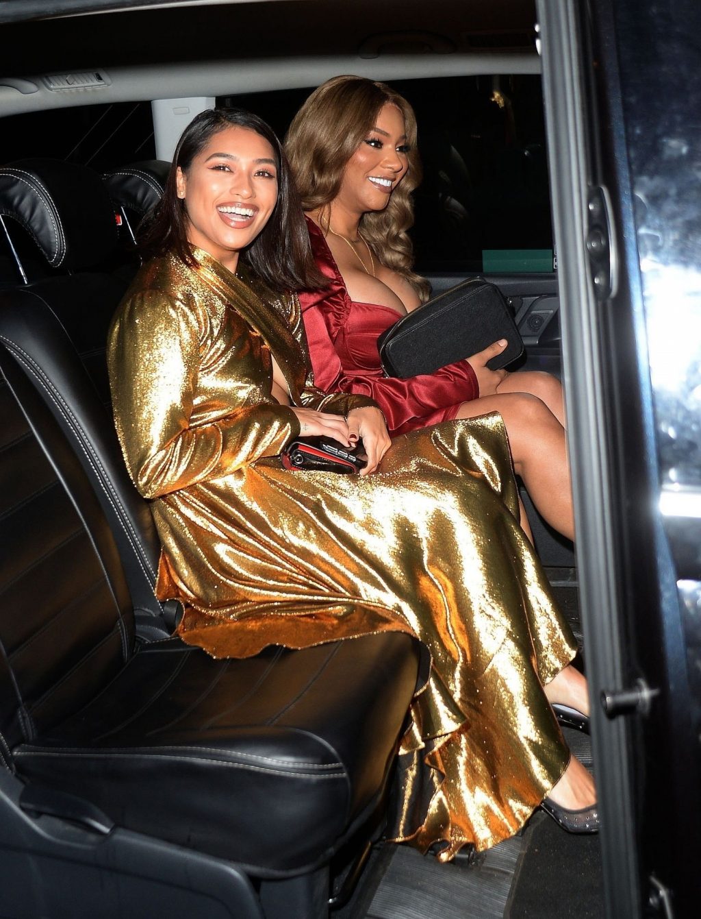 La chanteuse Vanessa White a été photographiée sans soutien-gorge dans une robe dorée en quittant la fête de Pat McGrath avec Munroe Bergdorf à Londres, le 12/03/2019.