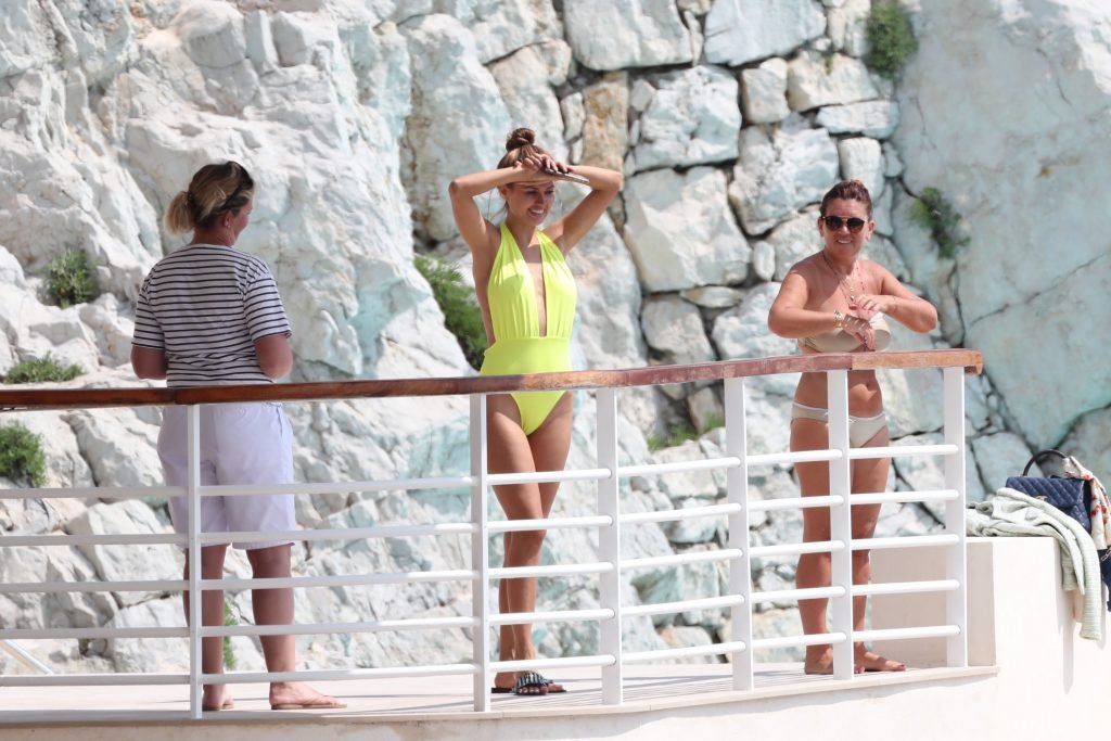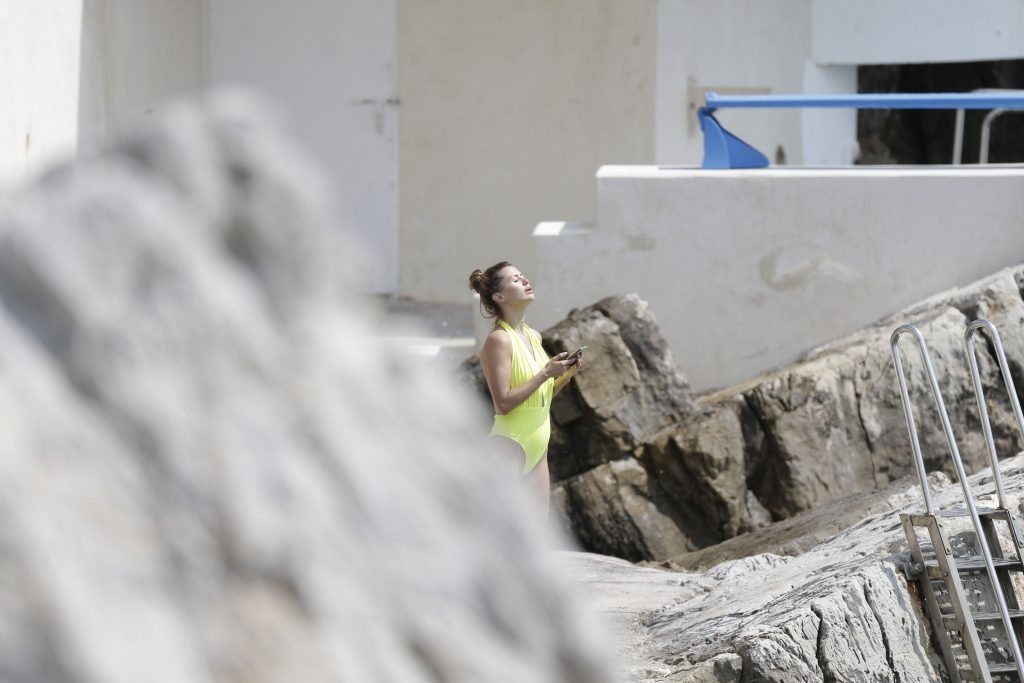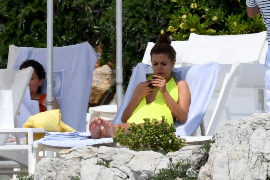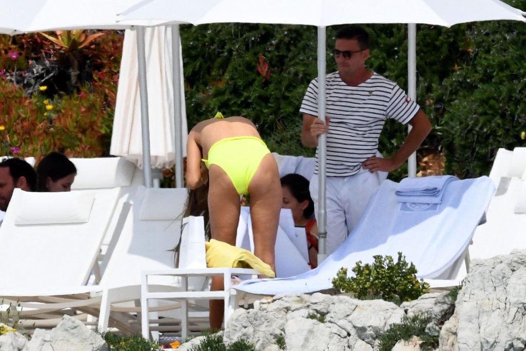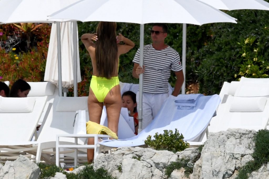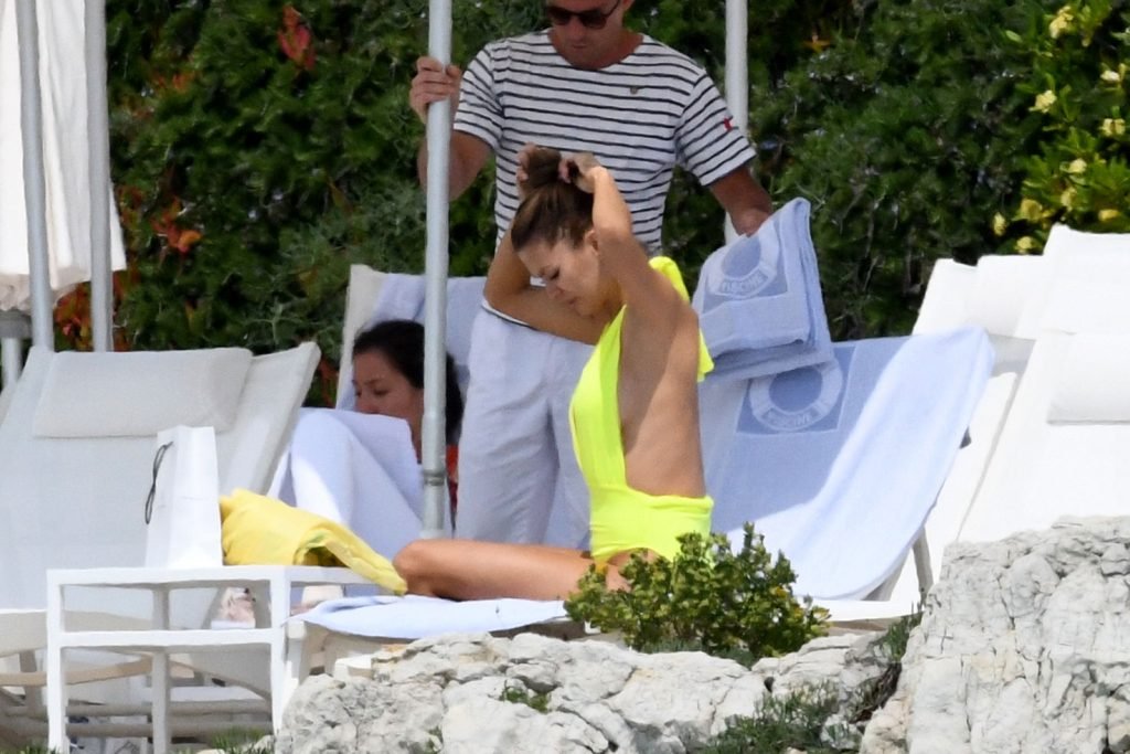 La présentatrice TV et mannequin Victoria Bonya (38 ans) profite du beau temps en maillot de bain jaune néon à l’Eden Roc à Antibes, le 05/09/2018. Victoria a pris l’avion depuis Los Angeles, a assisté à la cérémonie d’ouverture du Festival de Cannes et s’est bien reposée.
