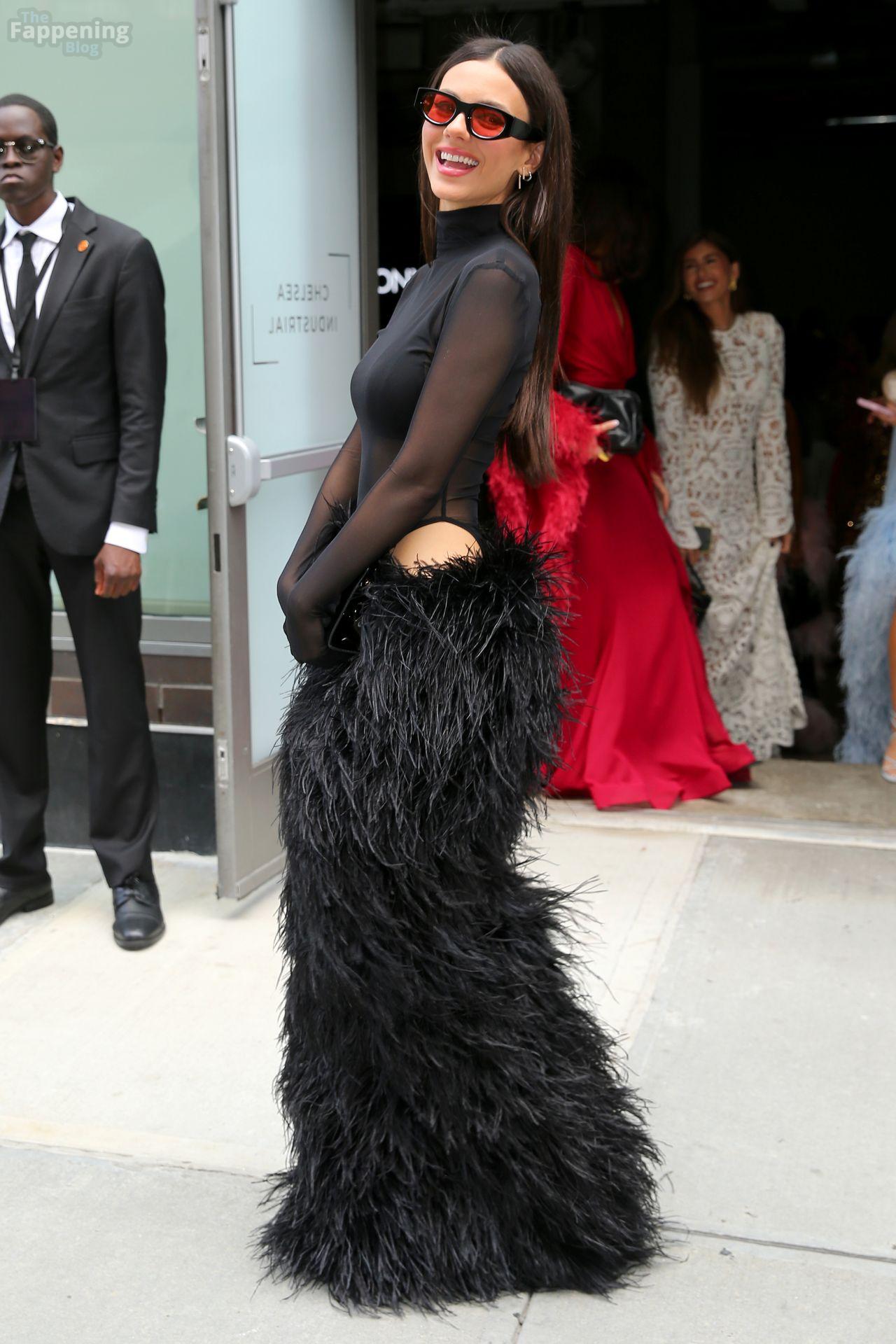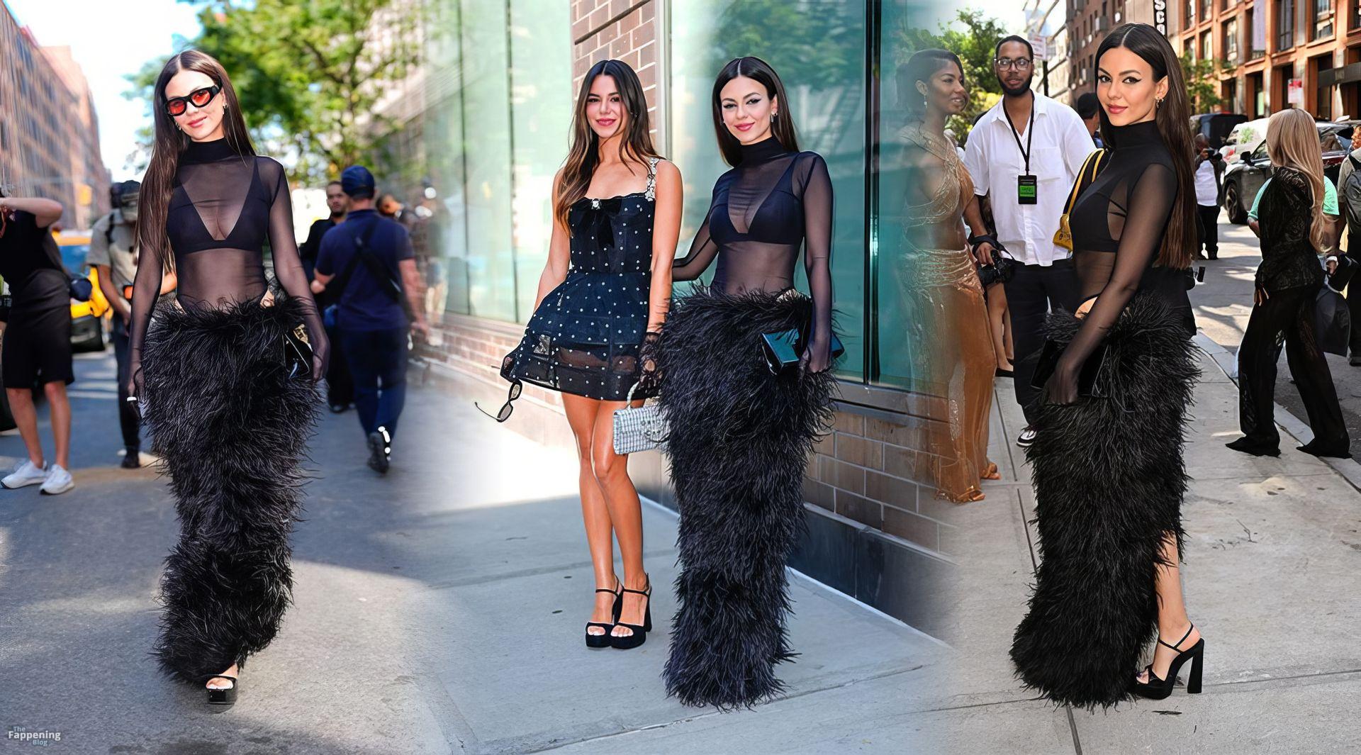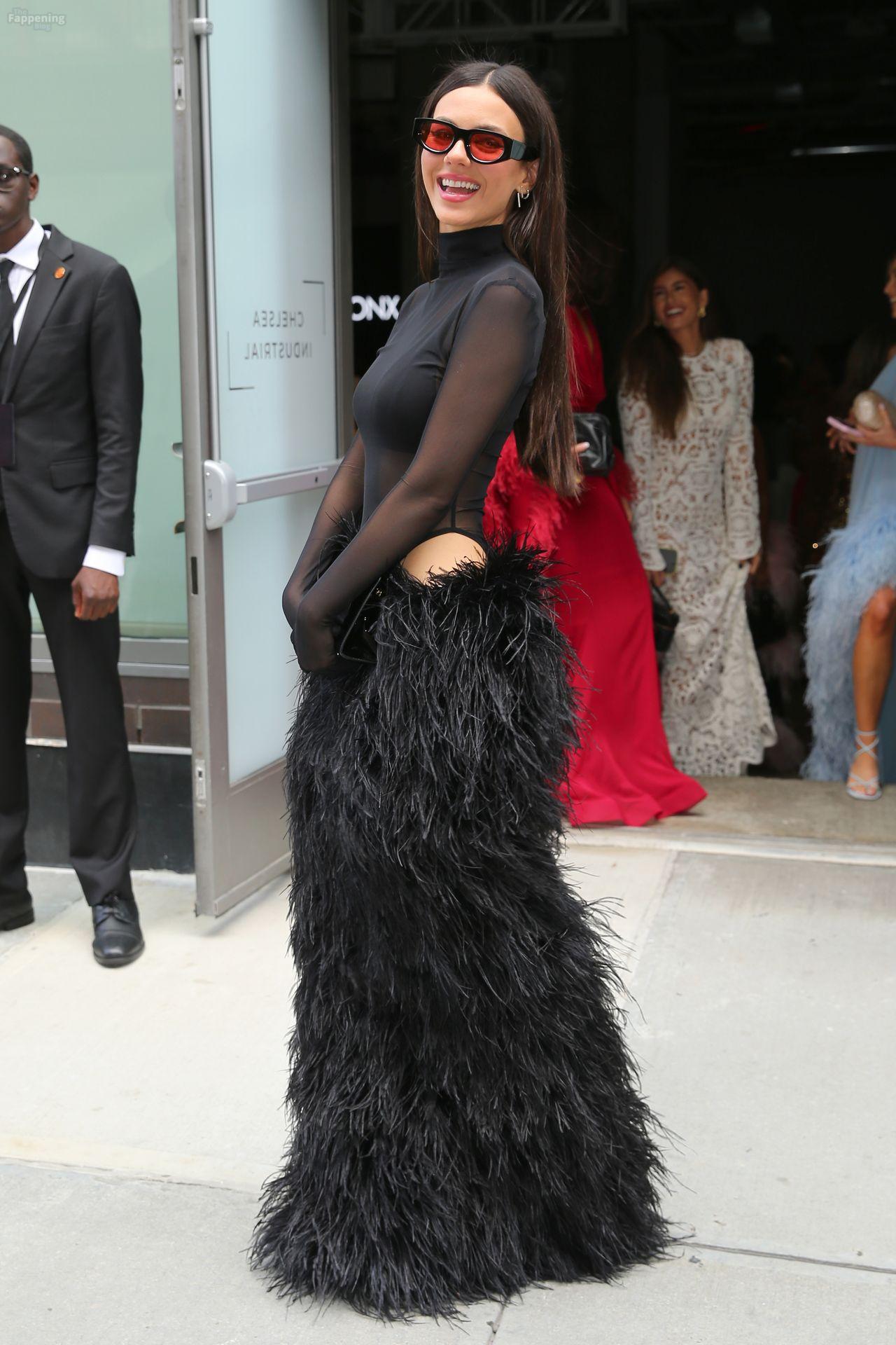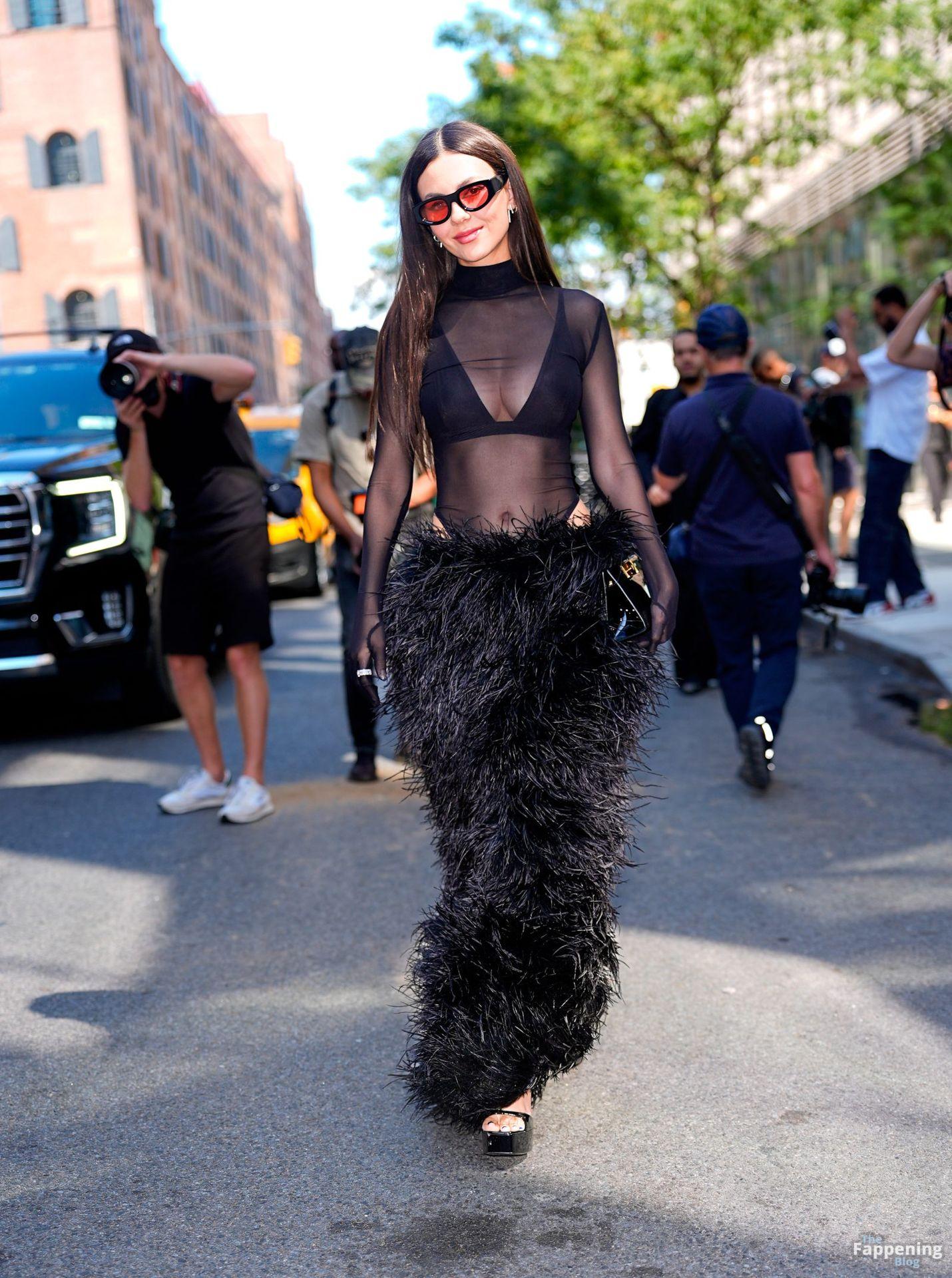 Victoria Justice assistait au défilé NYFW de Bronx and Banco, arborant un haut en maille noire transparente, un soutien-gorge noir et une jupe longue noire en fourrure. Elle a complété ce look audacieux et haute couture avec des lunettes de soleil et un sac noir, aperçue à l’extérieur du défilé pendant la Fashion Week de New York.