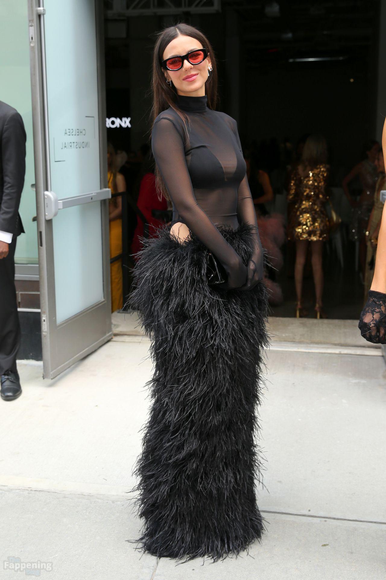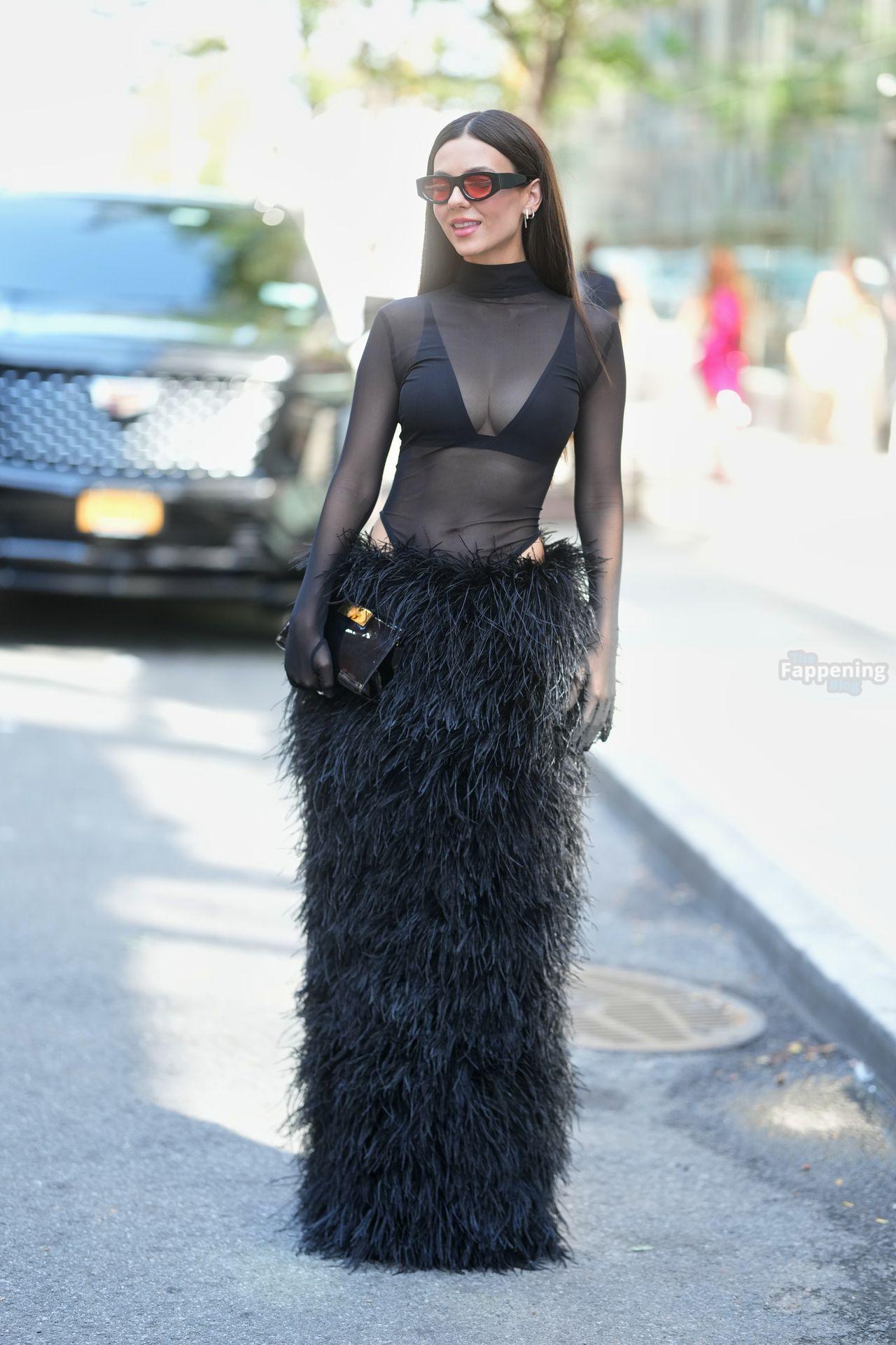 Victoria Justice assistait au défilé NYFW de Bronx and Banco, arborant un haut en maille noire transparente, un soutien-gorge noir et une jupe longue noire en fourrure. Elle a complété ce look audacieux et haute couture avec des lunettes de soleil et un sac noir, aperçue à l’extérieur du défilé pendant la Fashion Week de New York.