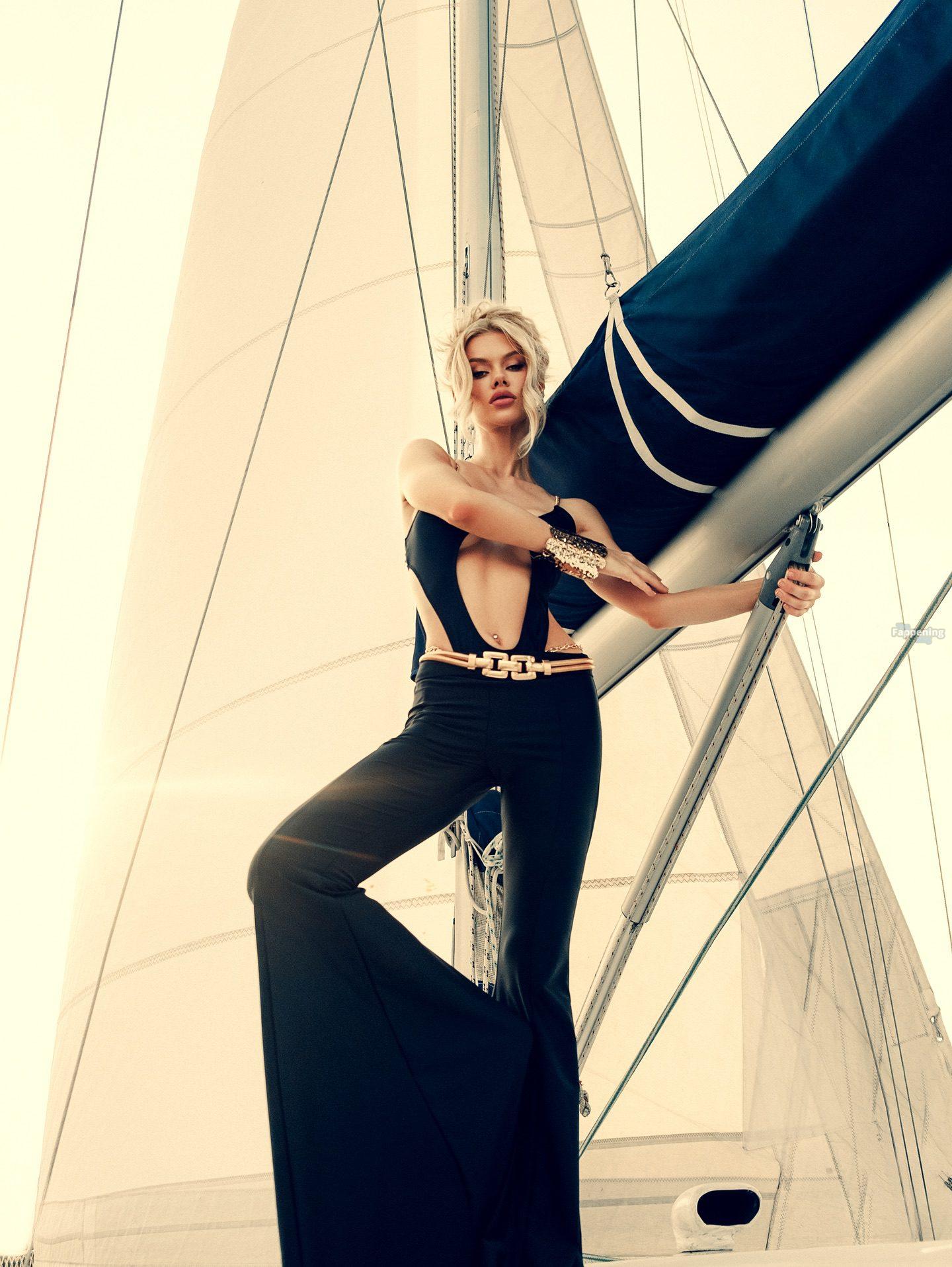 Viktoria Apanasenko montre ses seins, portant un body sexy découpé dans une séance photo torride sur un yacht par Iryna Rul.