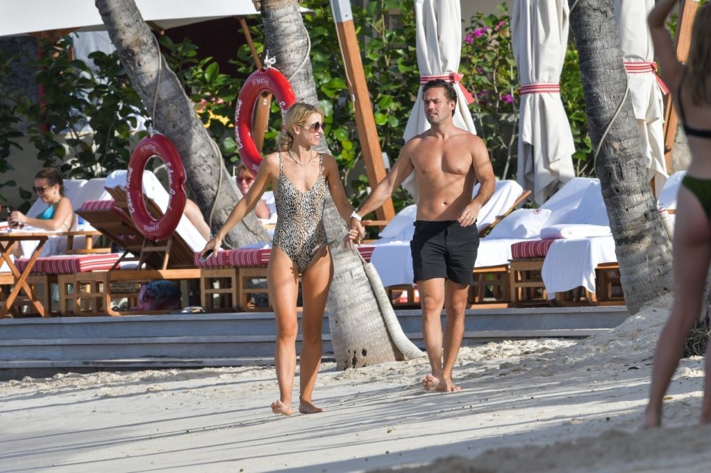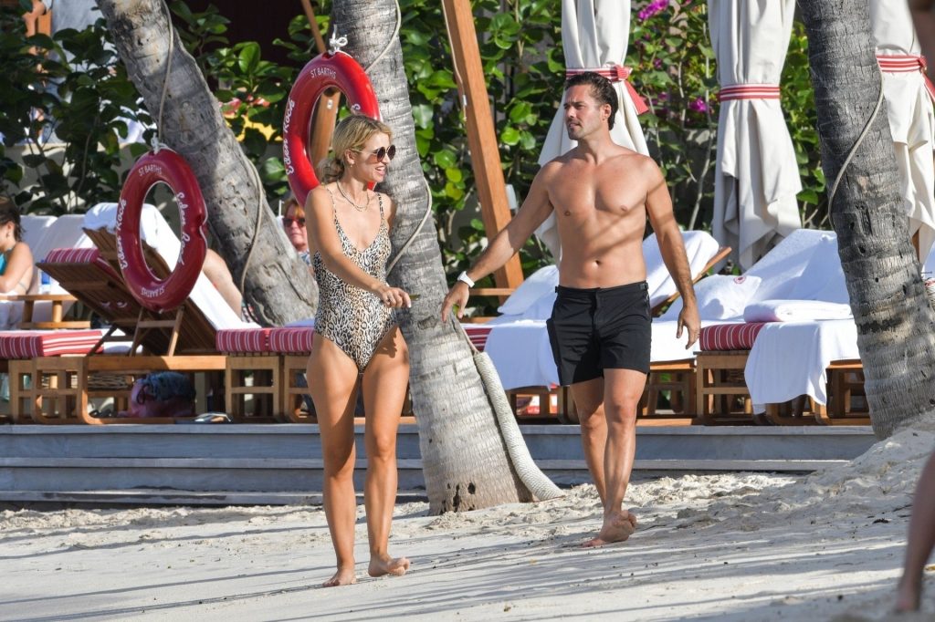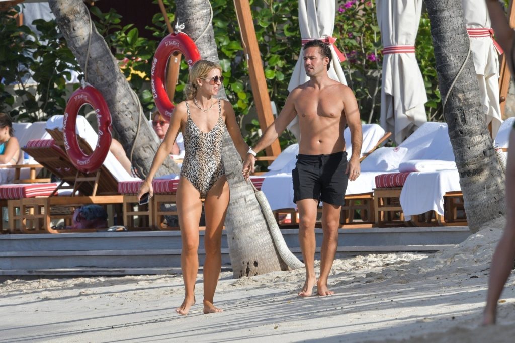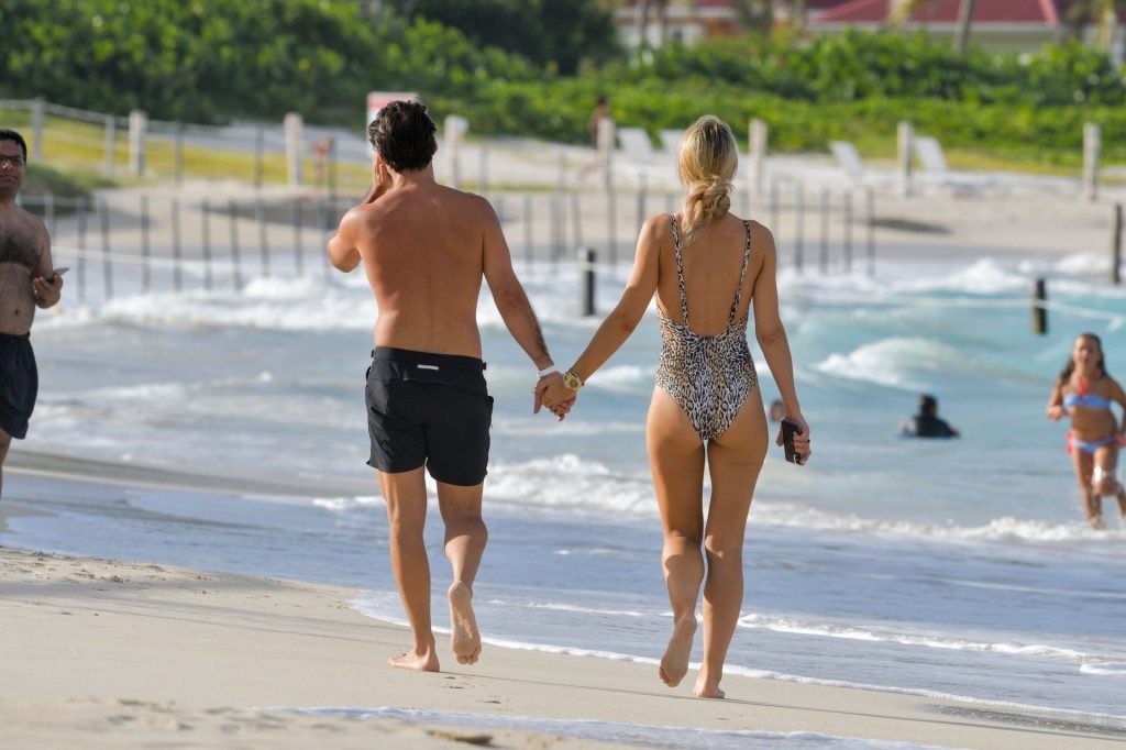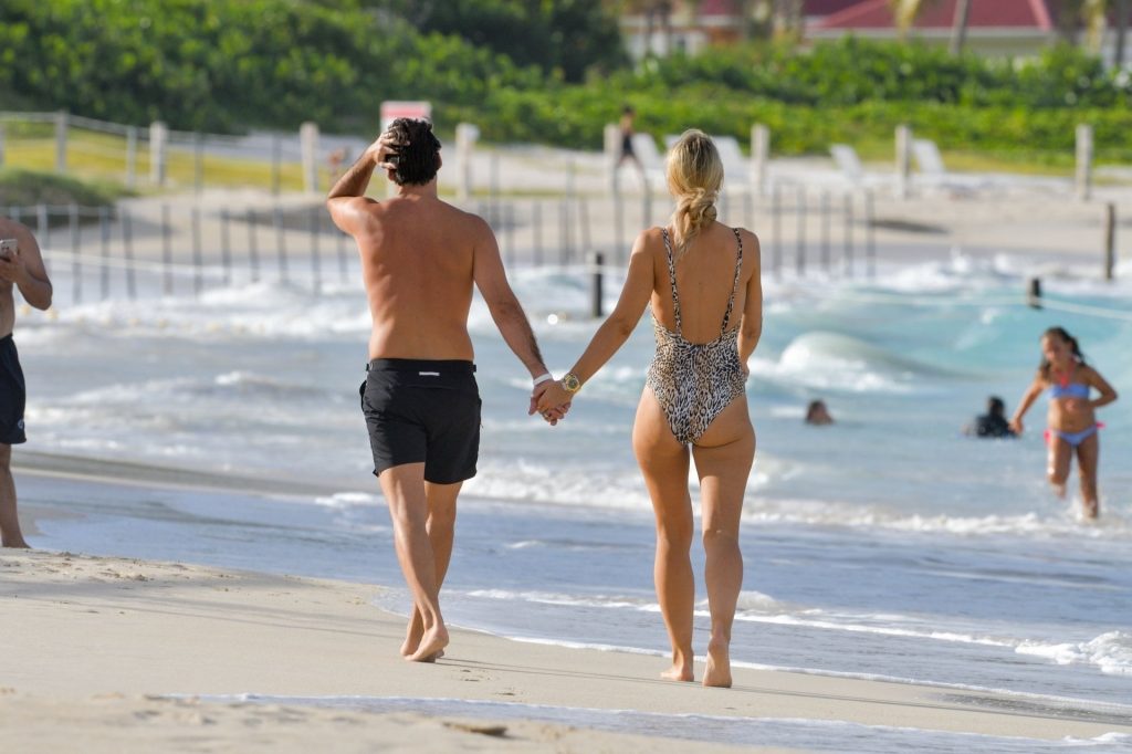 Les tourtereaux Vogue Williams et Spencer Mattews ont l’air très amoureux alors qu’ils se promènent sur la plage pendant leur séjour de vacances à l’hôtel Eden Roc beach à St Barts, 15/12/2019.