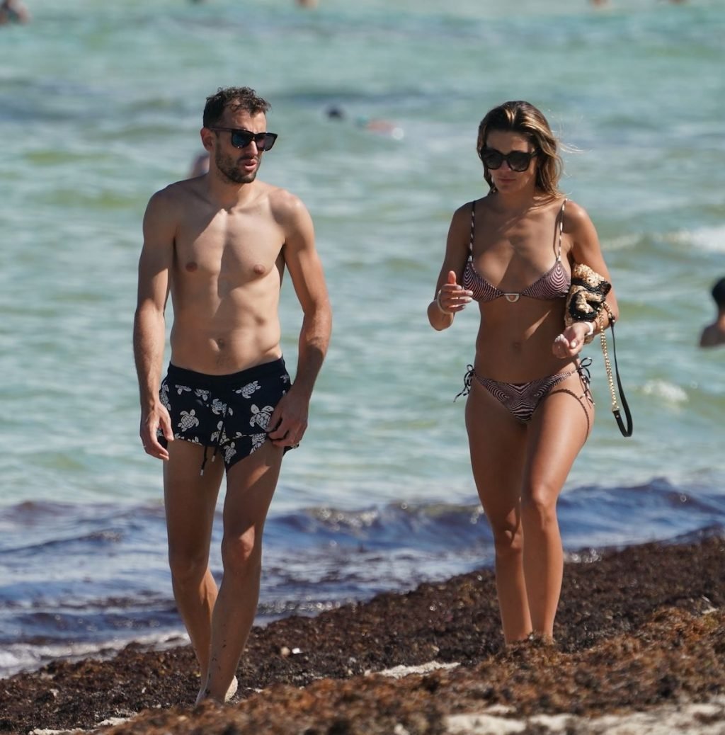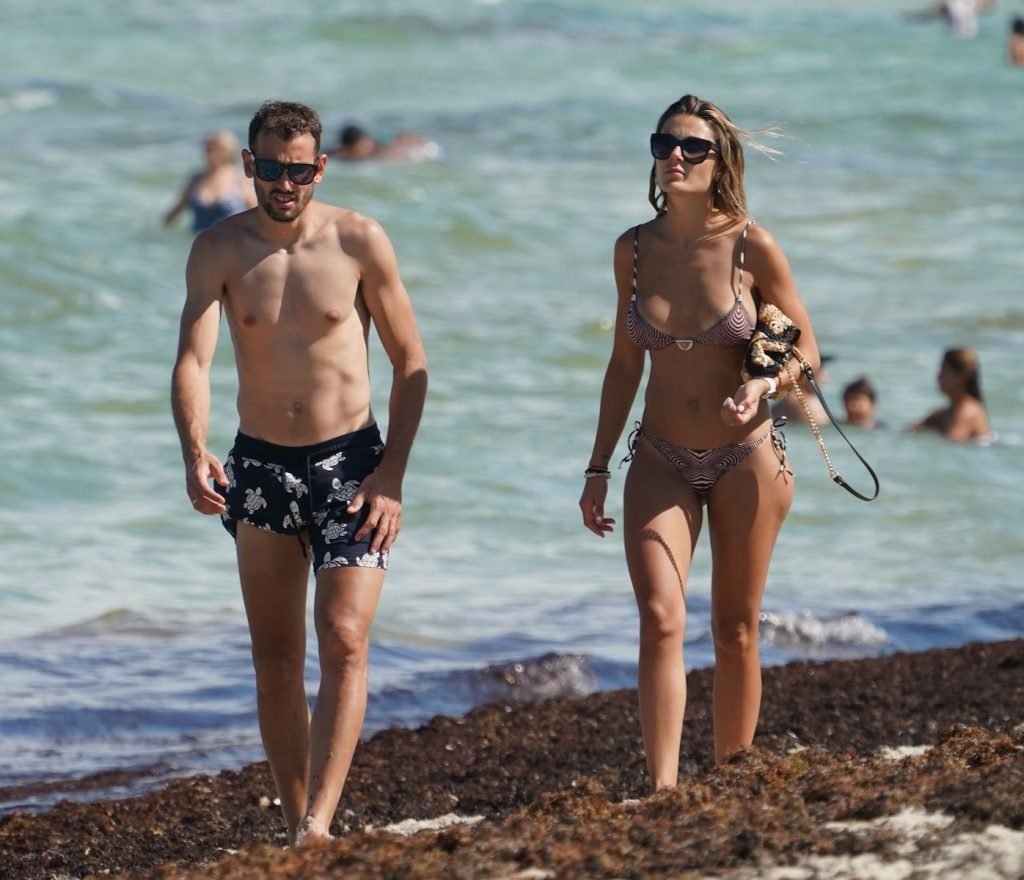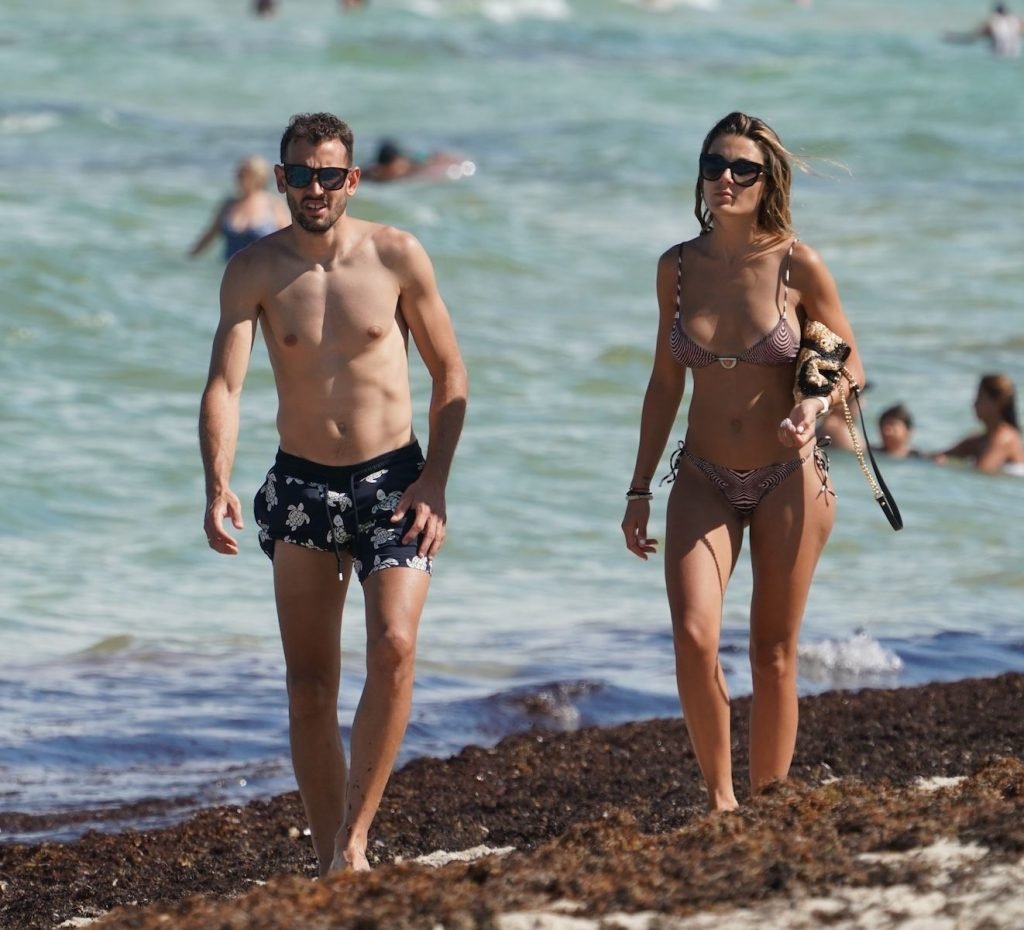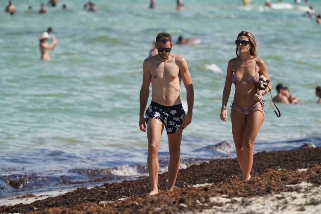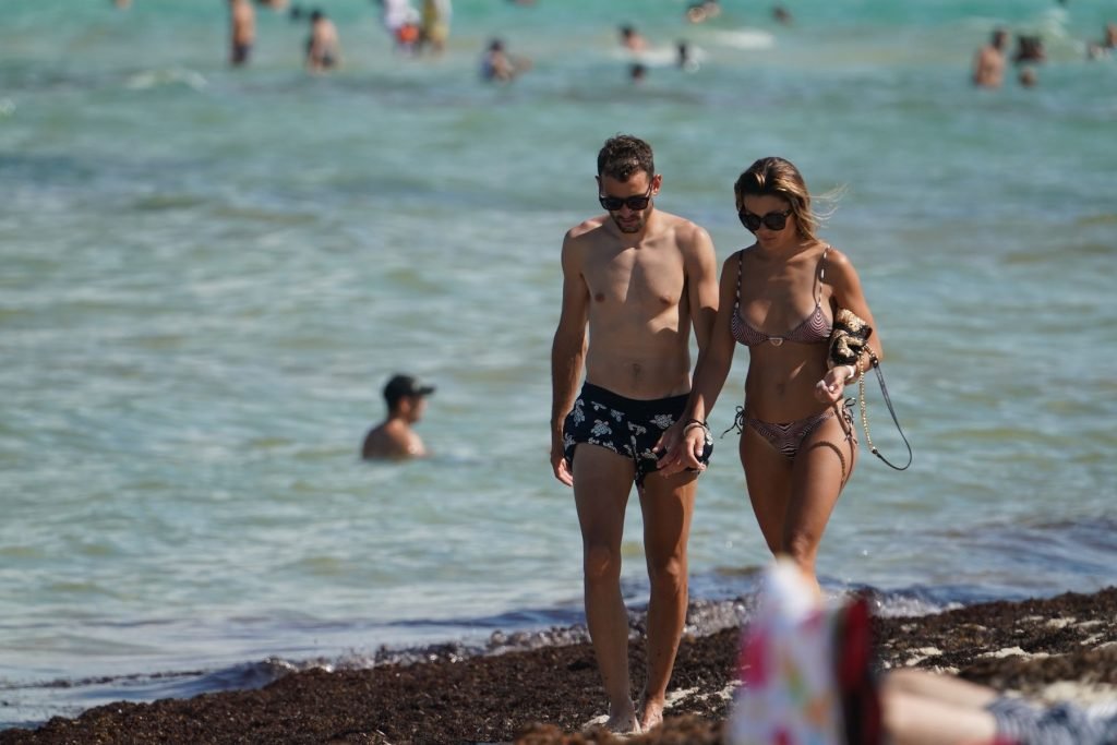 L’attaquant de Girona Cristhian Stuani et sa petite amie Ximena Pippo se promènent à Miami Beach, le 15/07/2019. Stuani profite de ses vacances après la Copa America en Floride.