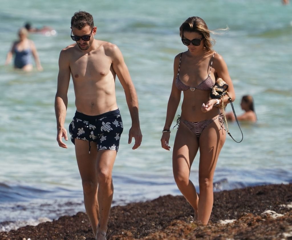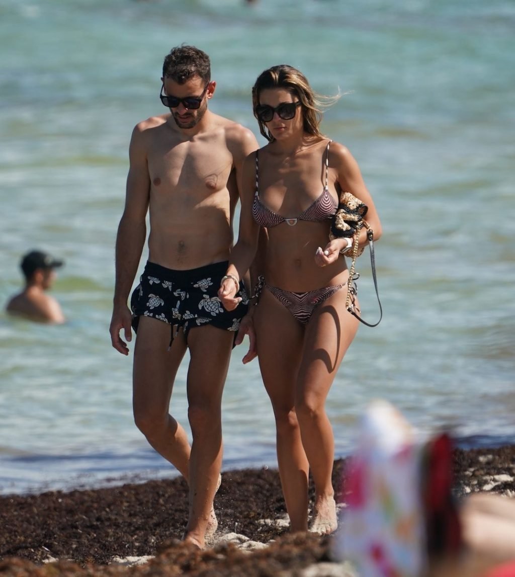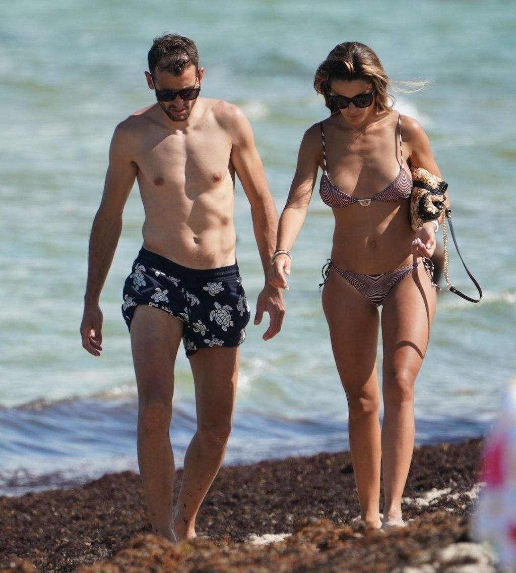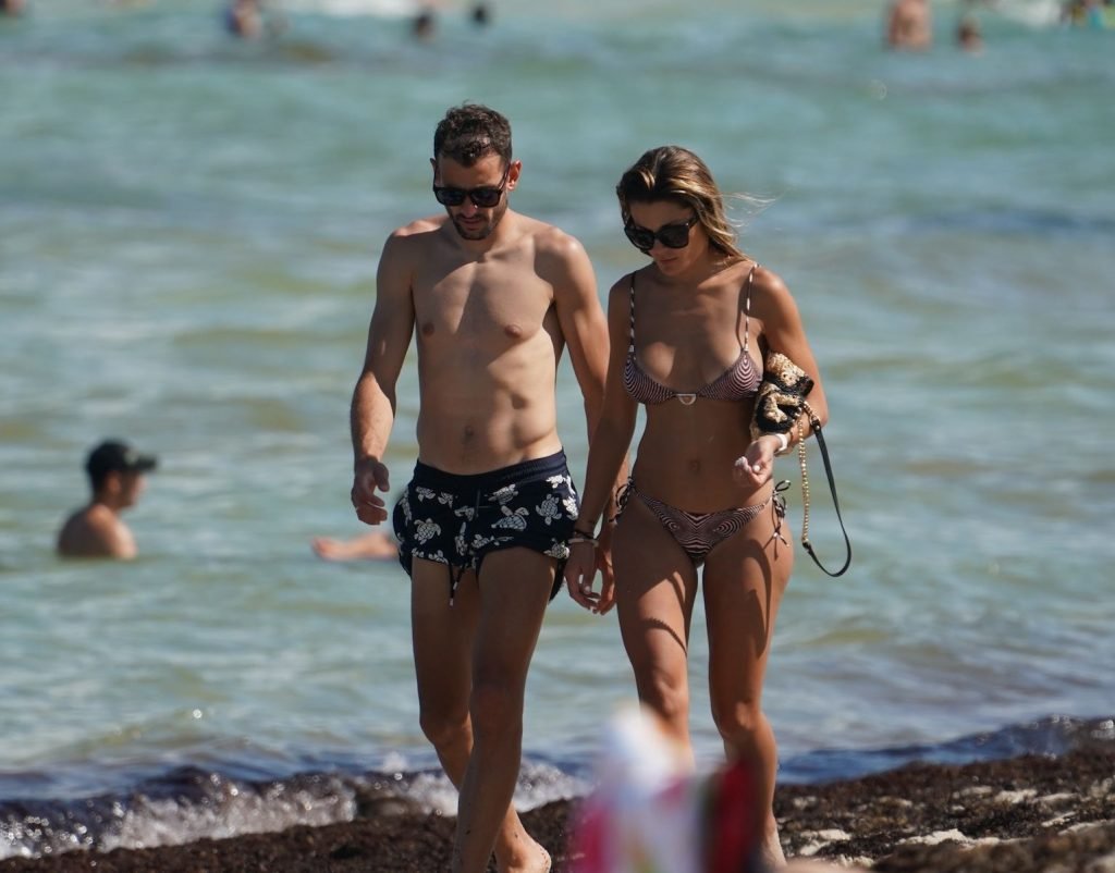 L’attaquant de Girona Cristhian Stuani et sa petite amie Ximena Pippo se promènent à Miami Beach, le 15/07/2019. Stuani profite de ses vacances après la Copa America en Floride.