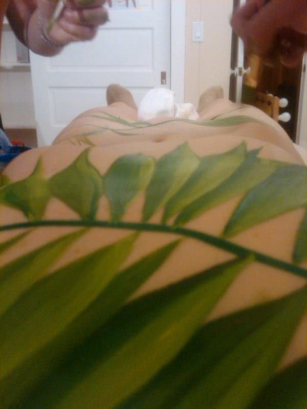 En ce qui concerne la peinture corporelle, cette peinture bleu-vert s'enroule du mauvais côté de sa hanche. Il devrait aussi y avoir des pointes pour les feuilles et une colonne vertébrale traversant le centre.
