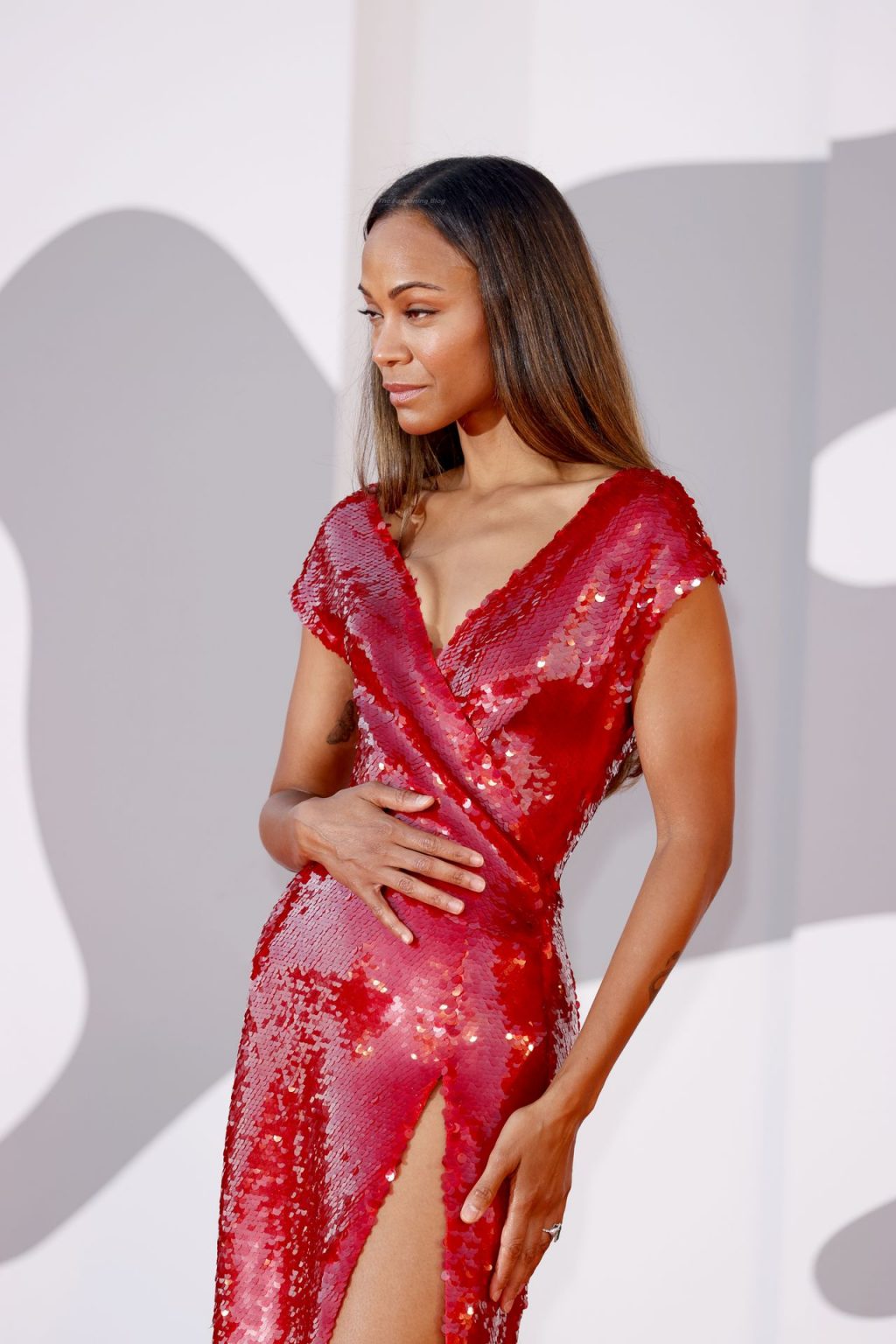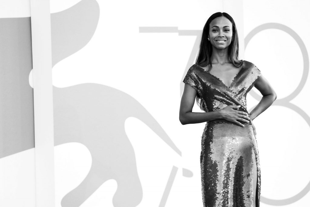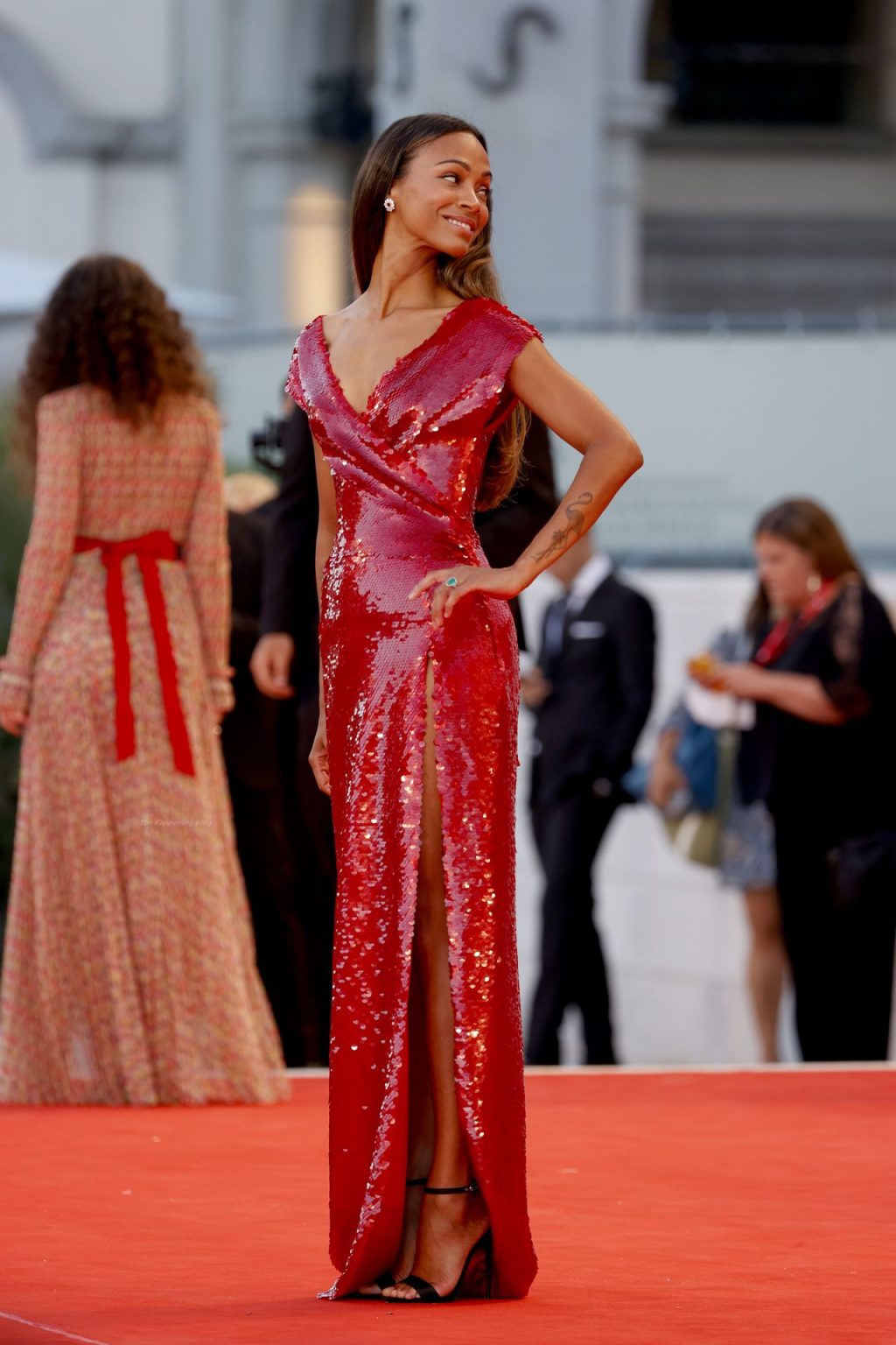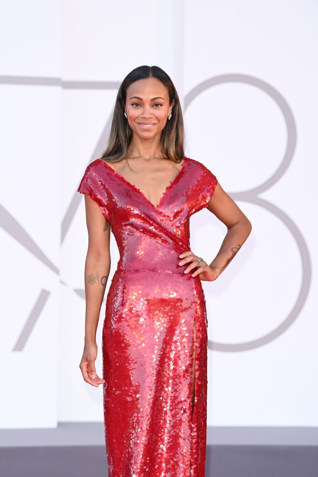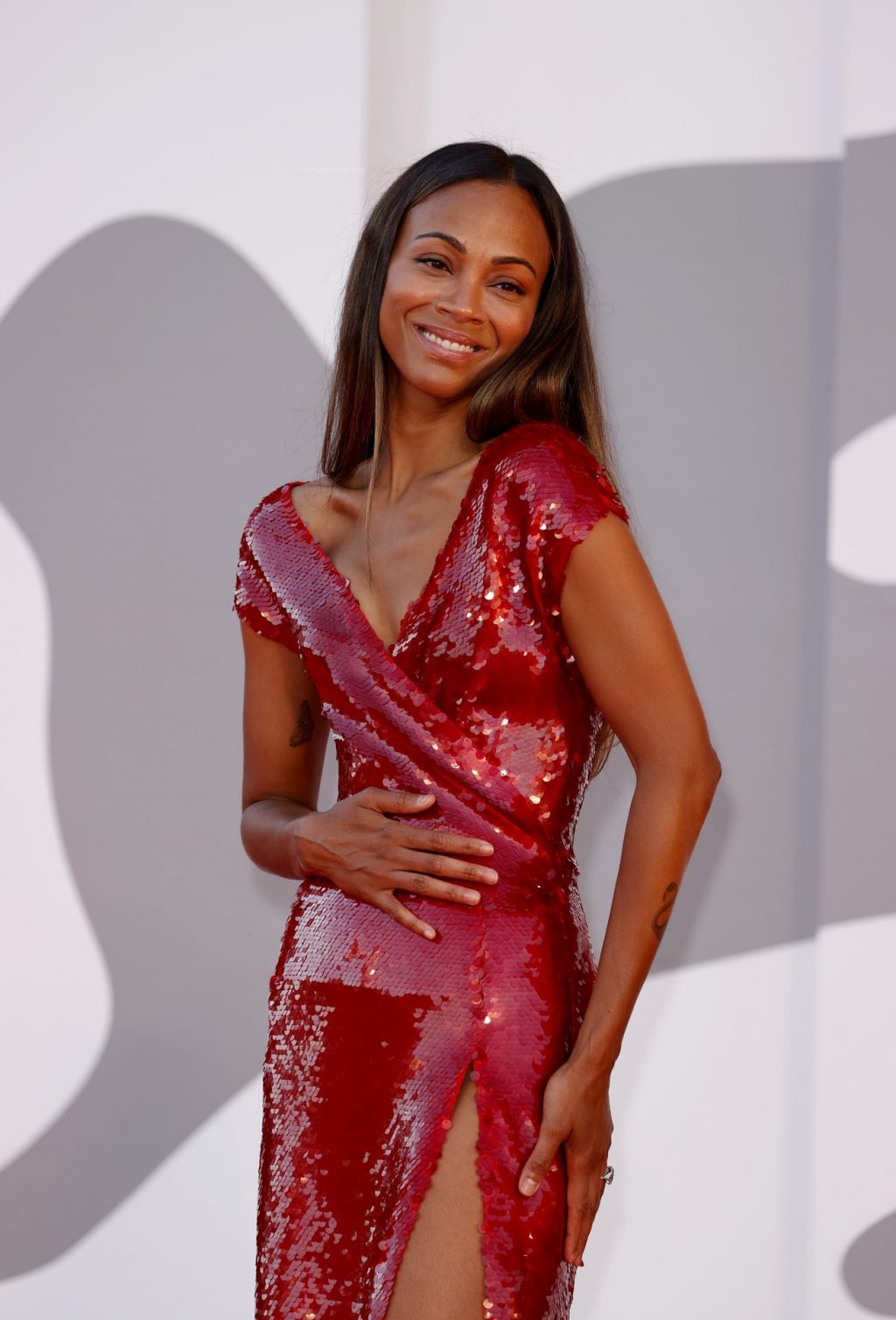 L’actrice américano-dominicaine Zoe Saldana arrive pour la projection du film “E stata la mano di Dio” (La Main de Dieu) présenté en compétition lors du 78e Festival du film de Venise au Lido de Venise, 02/09/2021.