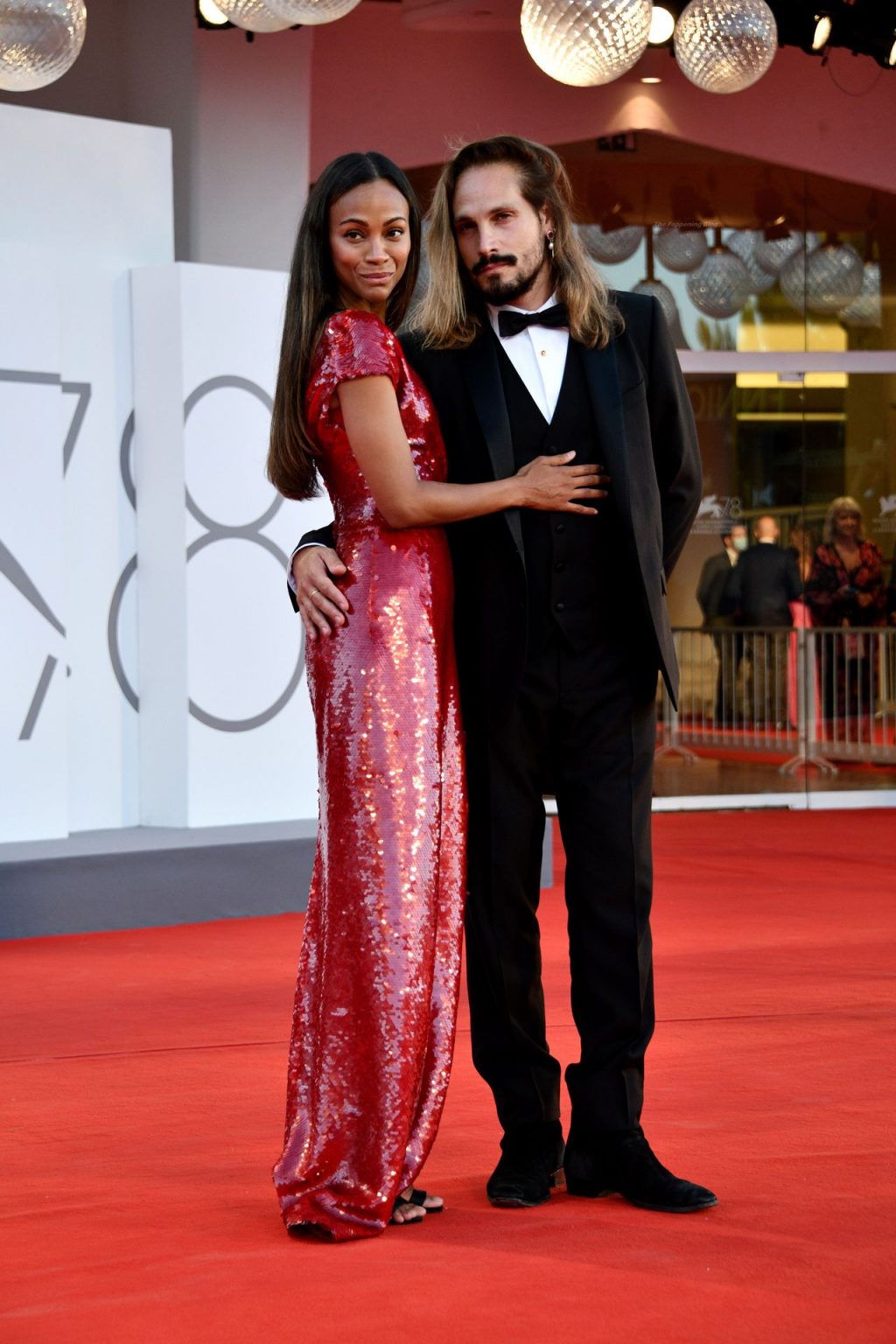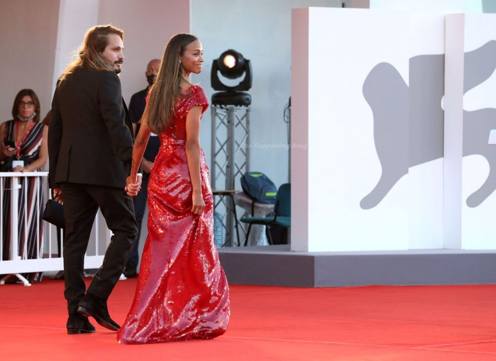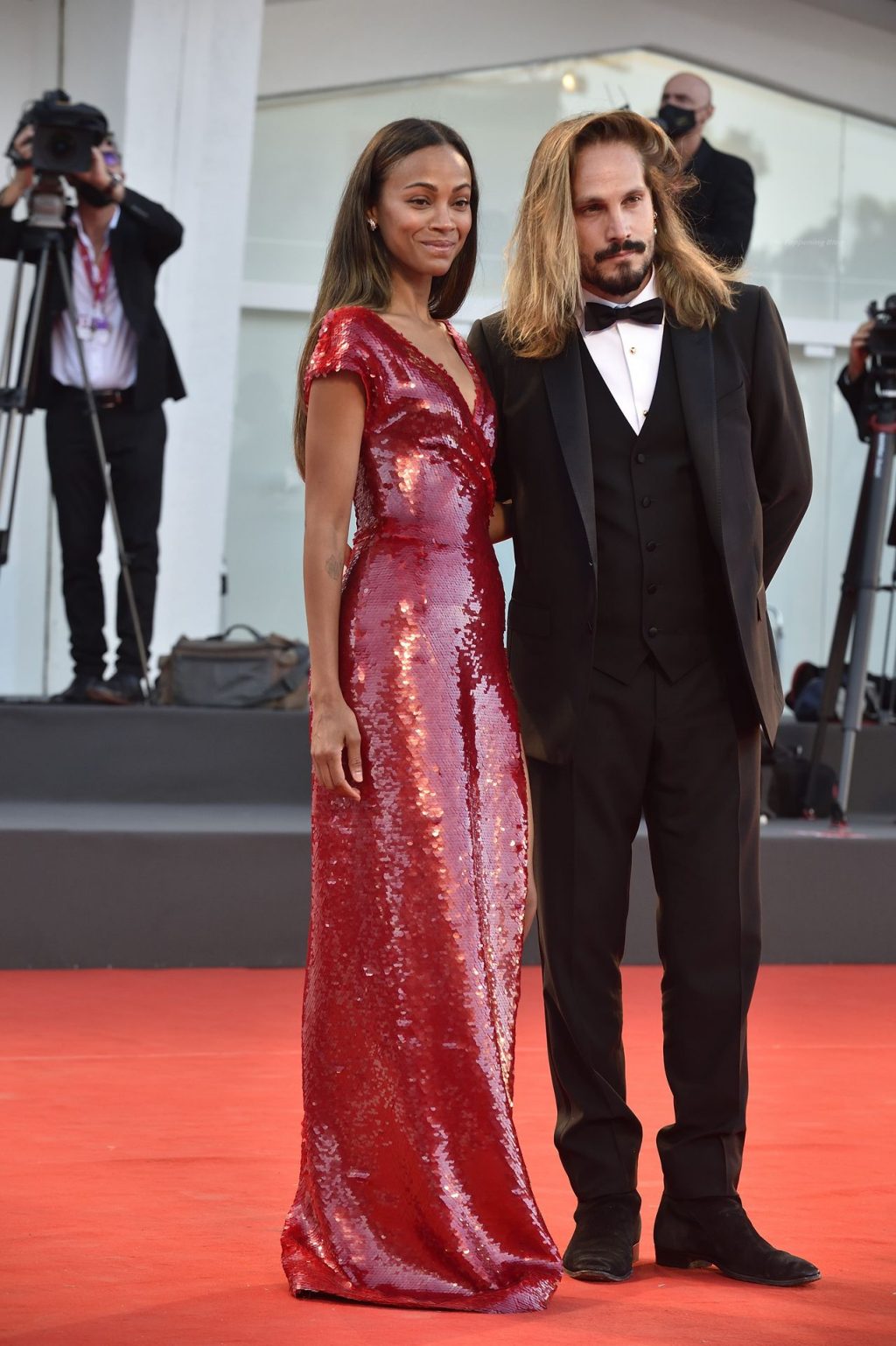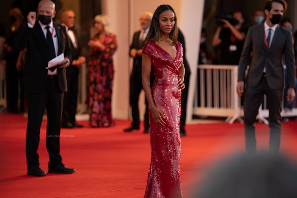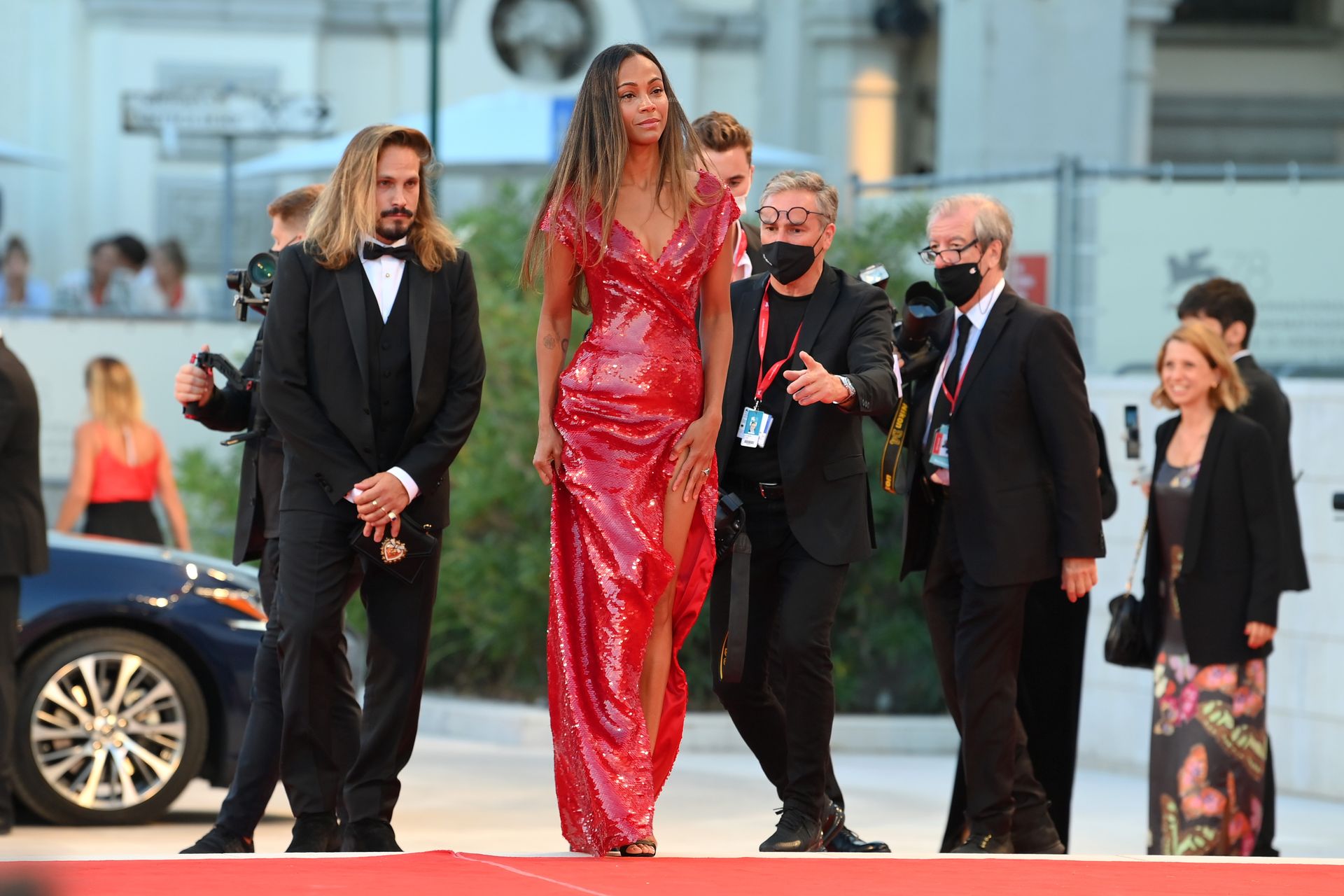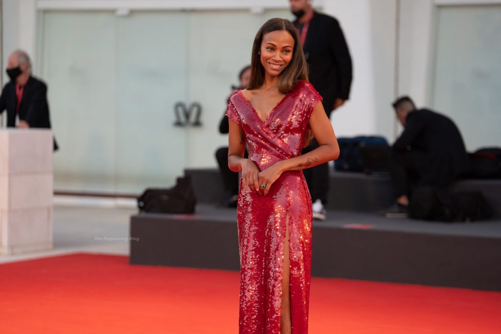 L’actrice américano-dominicaine Zoe Saldana arrive pour la projection du film “E stata la mano di Dio” (La Main de Dieu) présenté en compétition lors du 78e Festival du film de Venise au Lido de Venise, 02/09/2021.