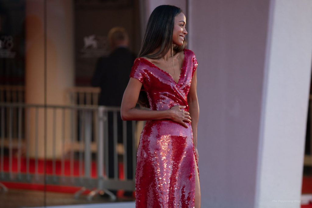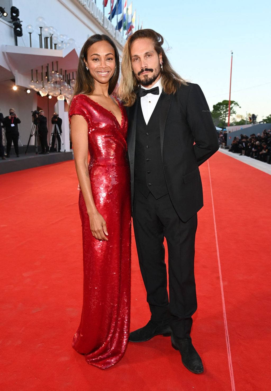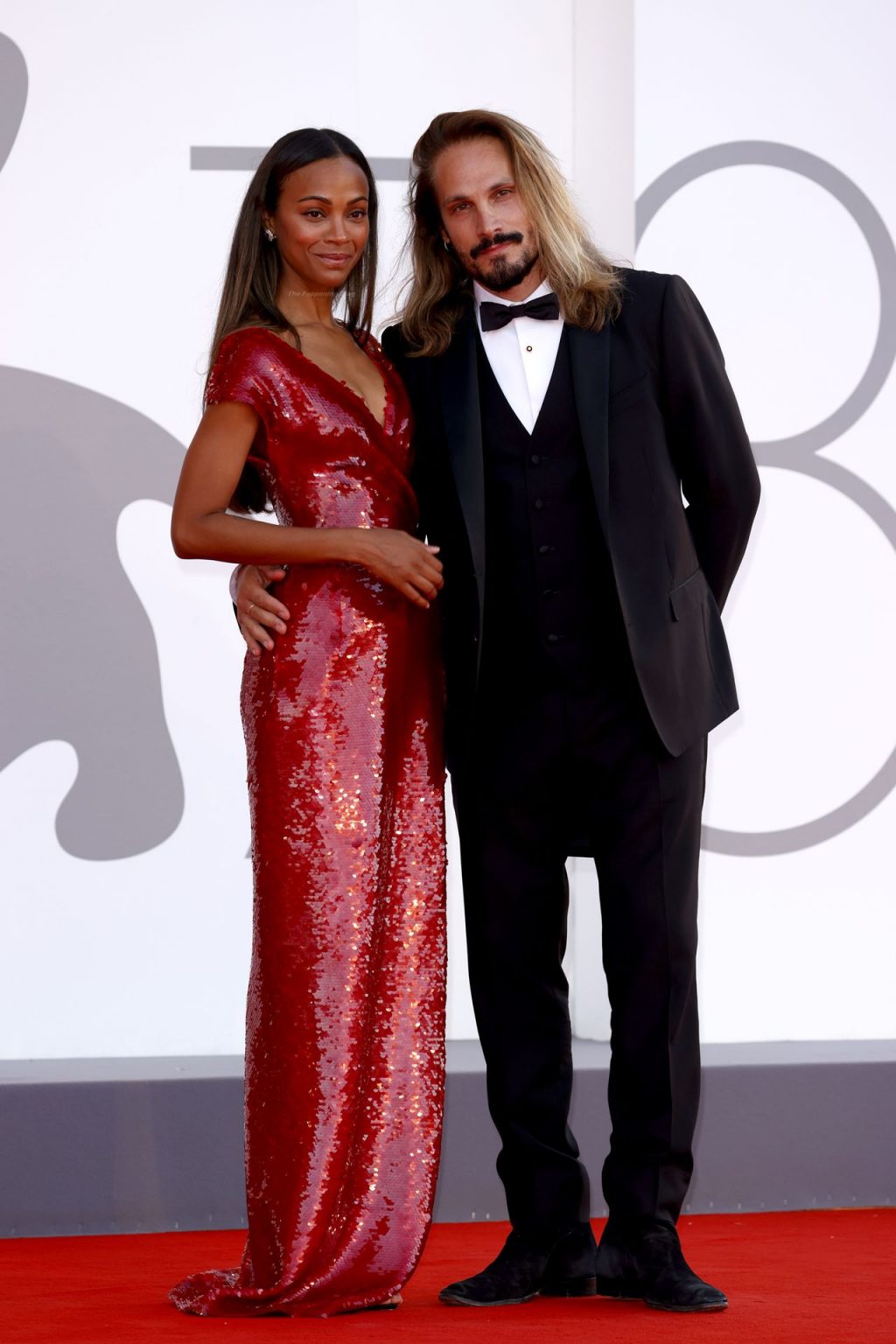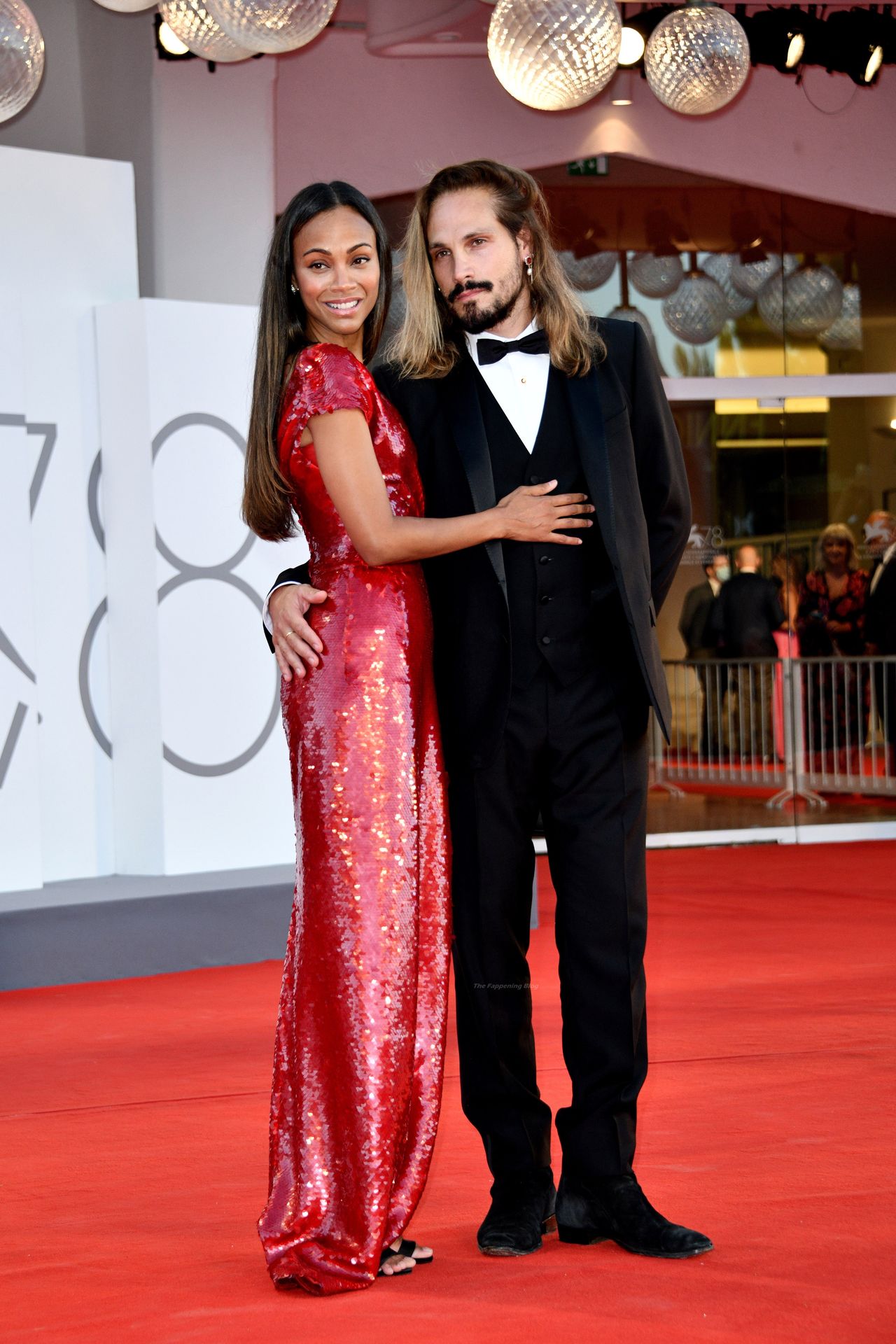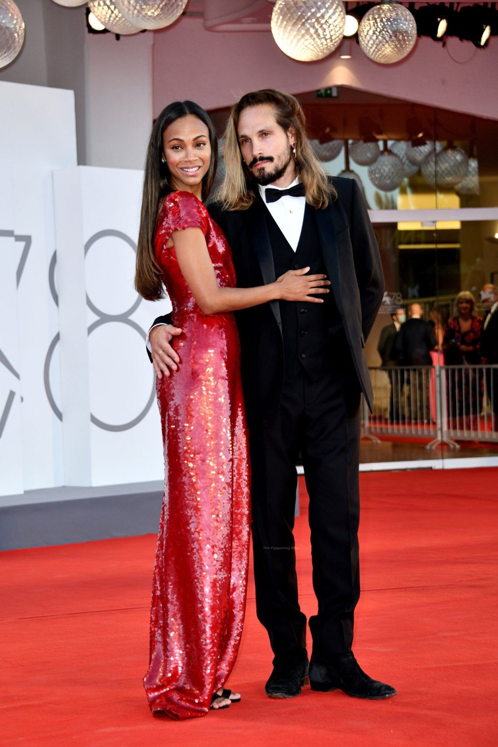 L’actrice américano-dominicaine Zoe Saldana arrive pour la projection du film “E stata la mano di Dio” (La Main de Dieu) présenté en compétition lors du 78e Festival du film de Venise au Lido de Venise, 02/09/2021.